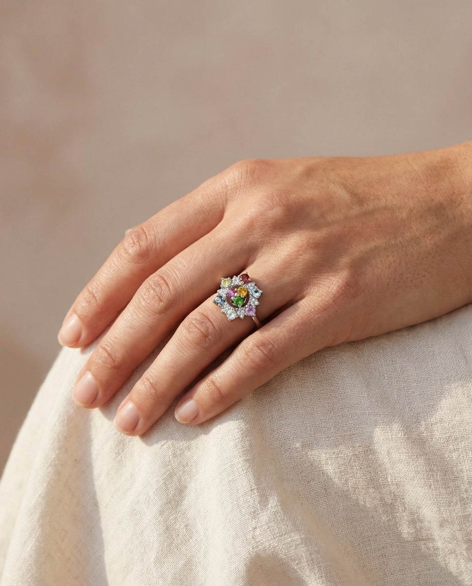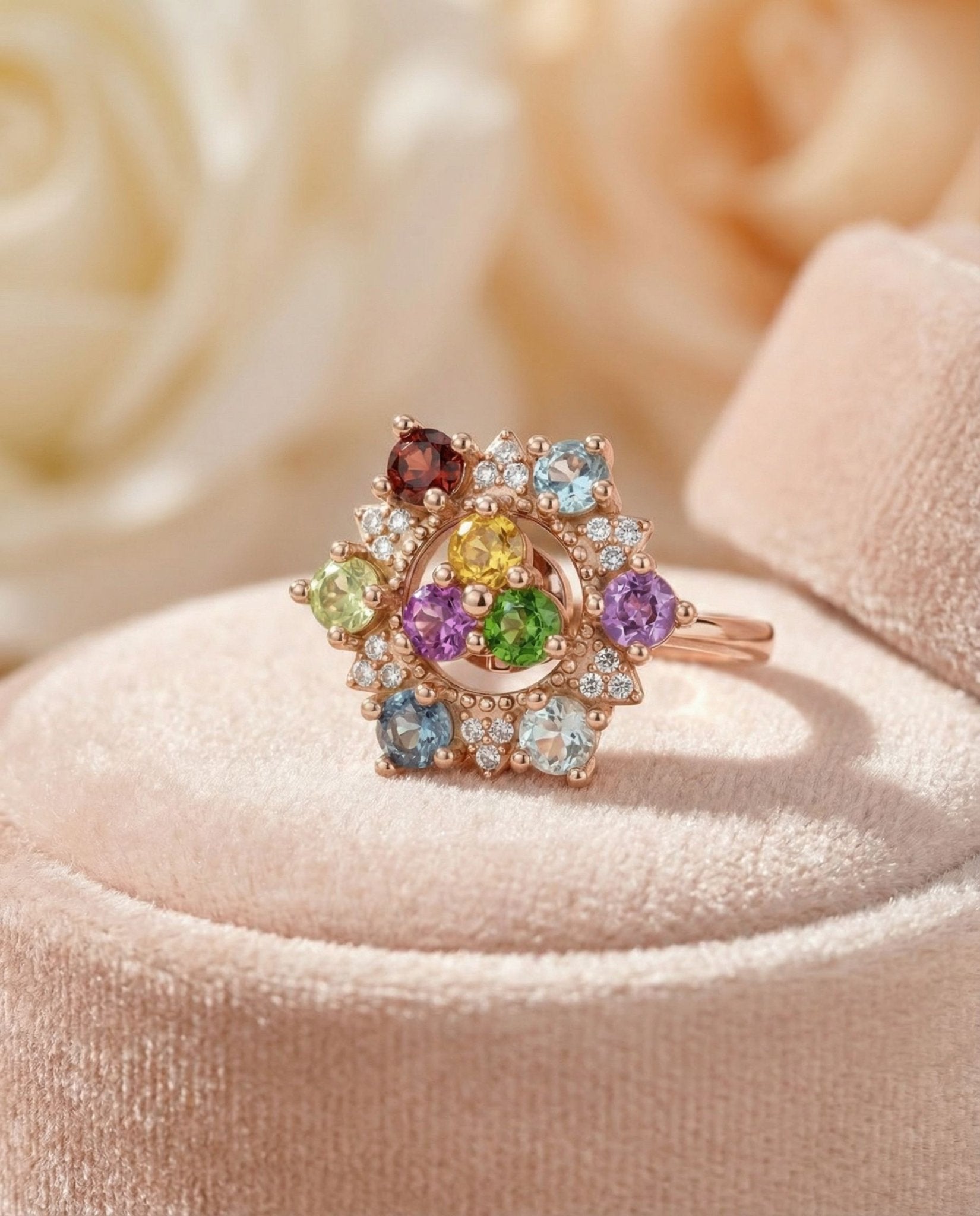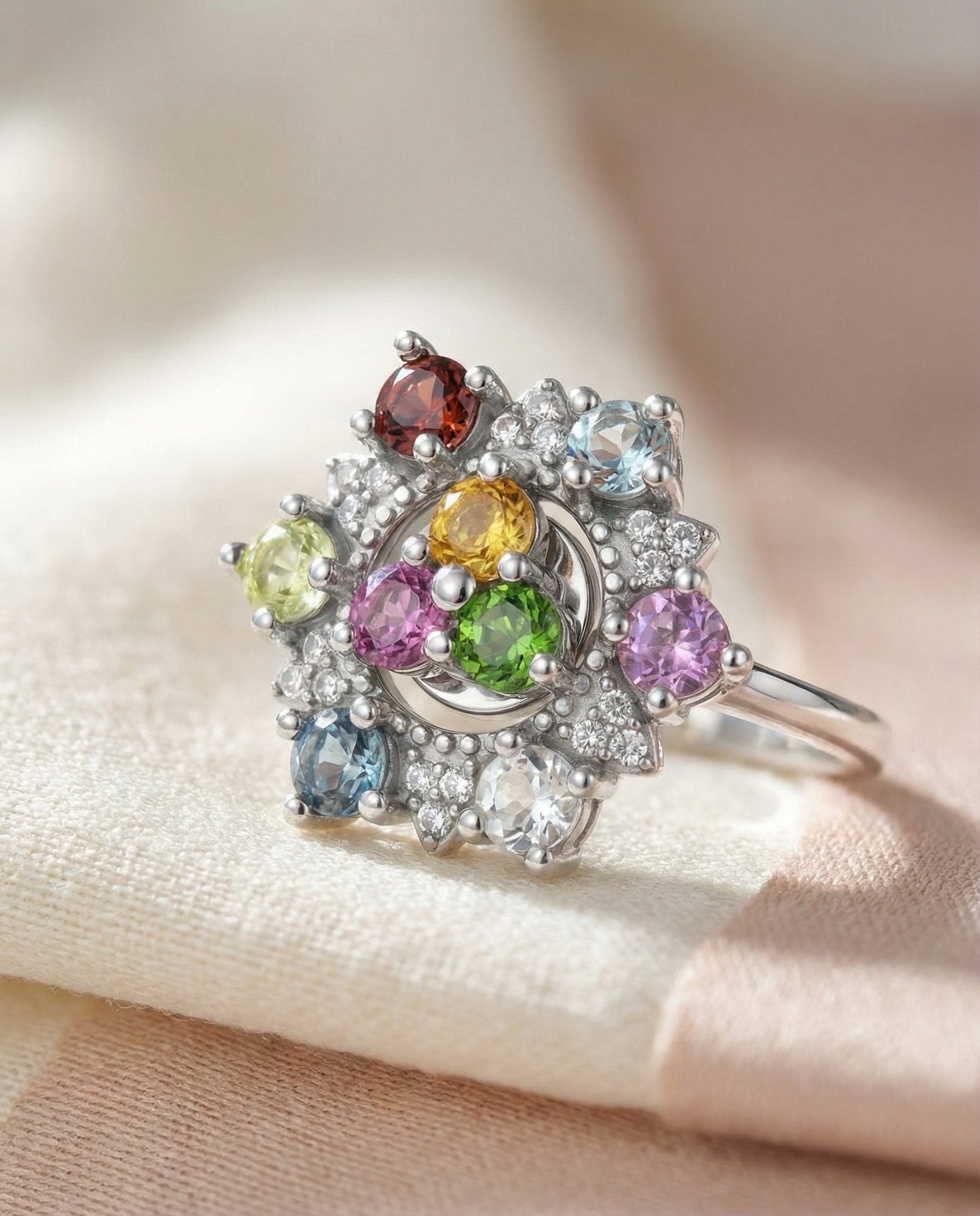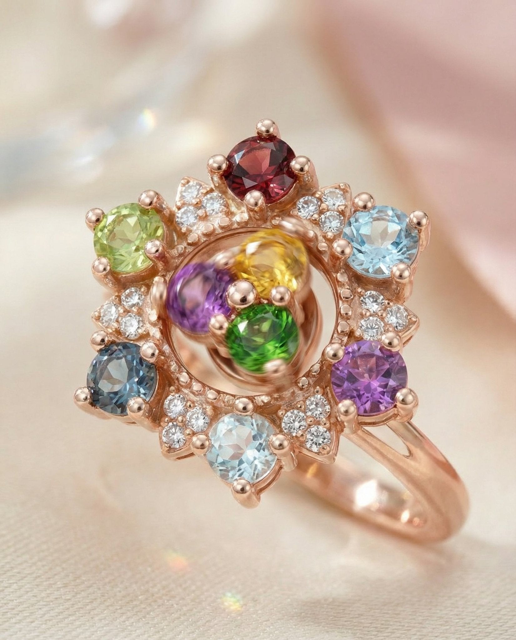 Introducing the Color Spin Ring, where playfulness meets poise. Handcrafted with all-natural gemstones, Peridot, Garnet, Sky Blue Topaz, Amethyst, Aquamarine, London Blue Topaz, Diopside, Rhodolite, and Citrine. Each gem gleams with its own radiant hue, coming together in a lively medley of color.
