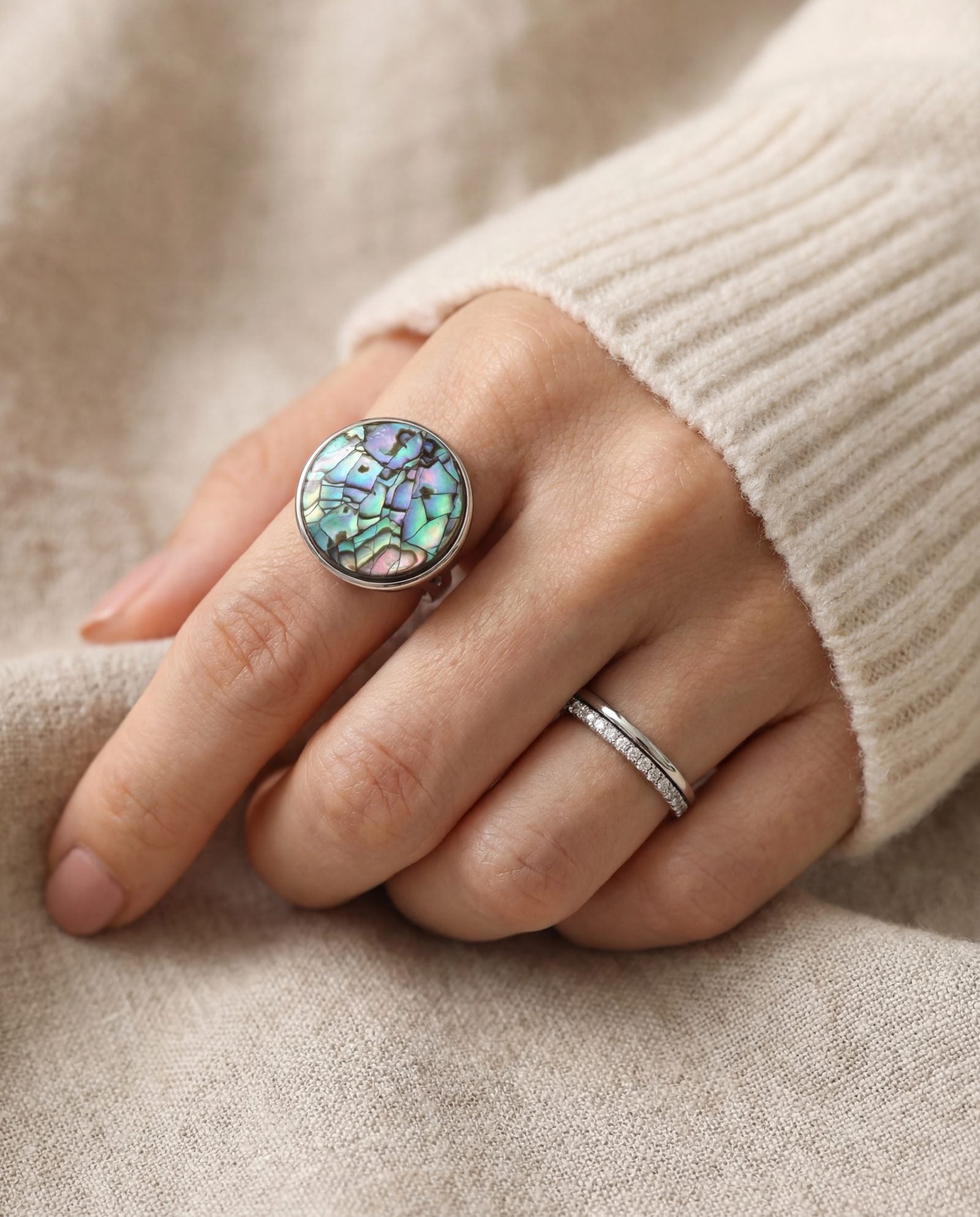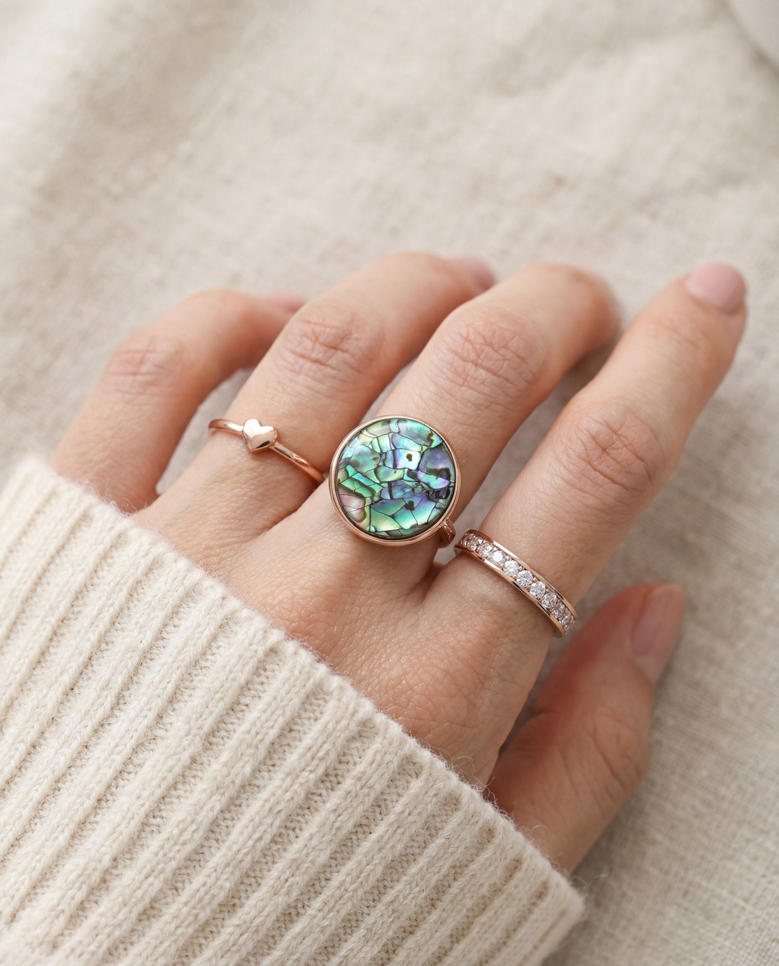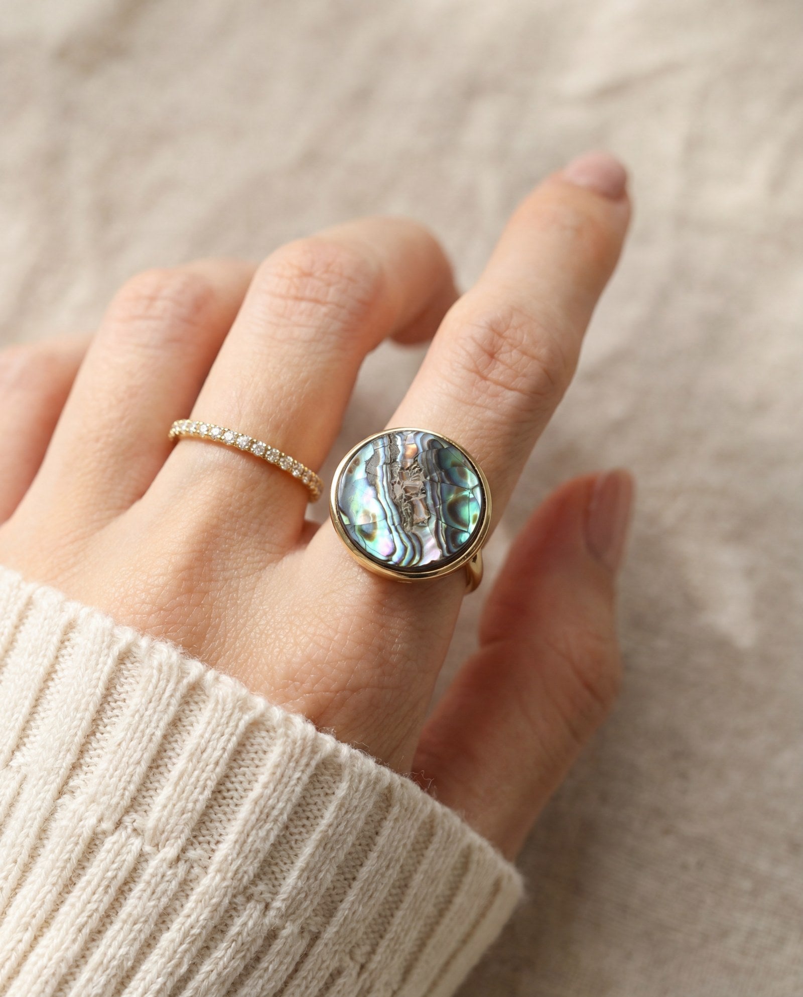 The Siren Shell Ring is a stunning masterpiece, featuring a mesmerizing abalone shell centerpiece that captures the ethereal glow of moonlight. Each ring showcases the natural, iridescent beauty of the shell, with swirling hues of teal, purple, and green that dance in the light.