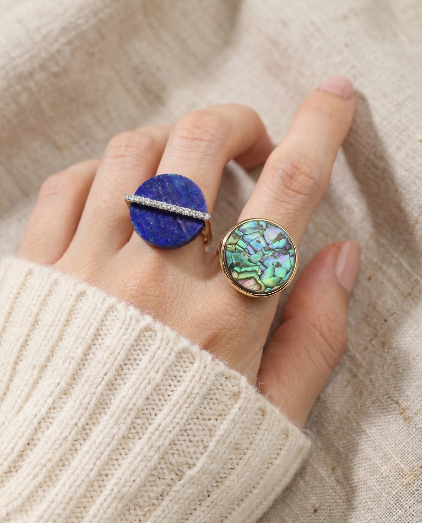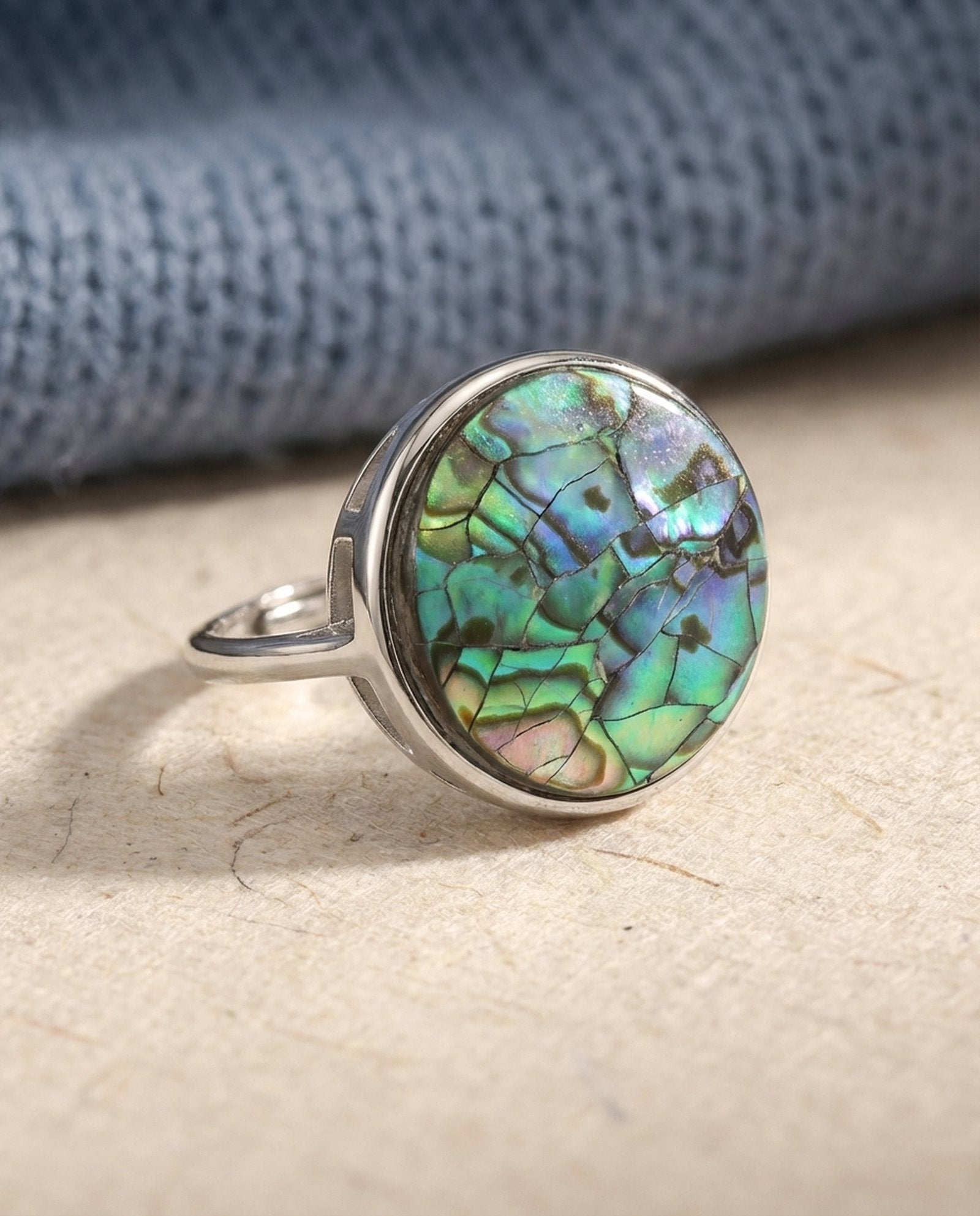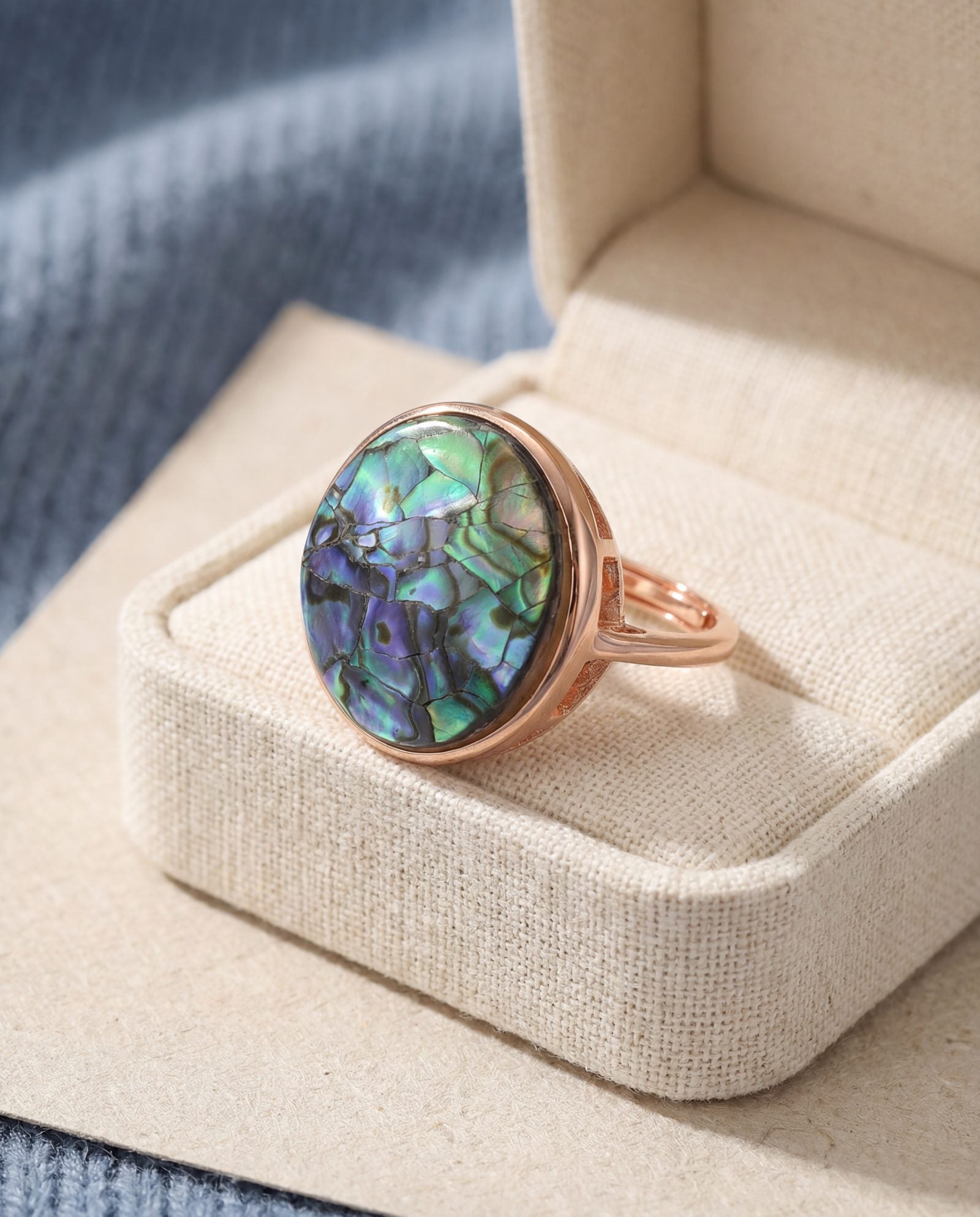 The Siren Shell Ring is a stunning masterpiece, featuring a mesmerizing abalone shell centerpiece that captures the ethereal glow of moonlight. Each ring showcases the natural, iridescent beauty of the shell, with swirling hues of teal, purple, and green that dance in the light.