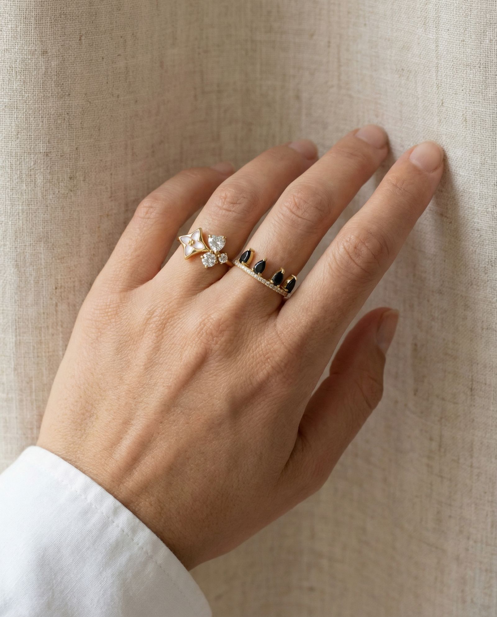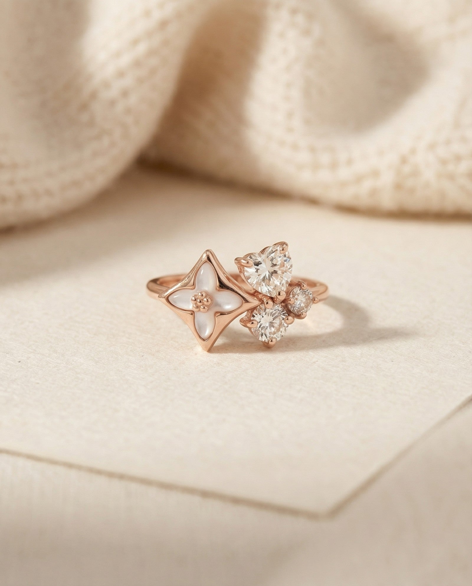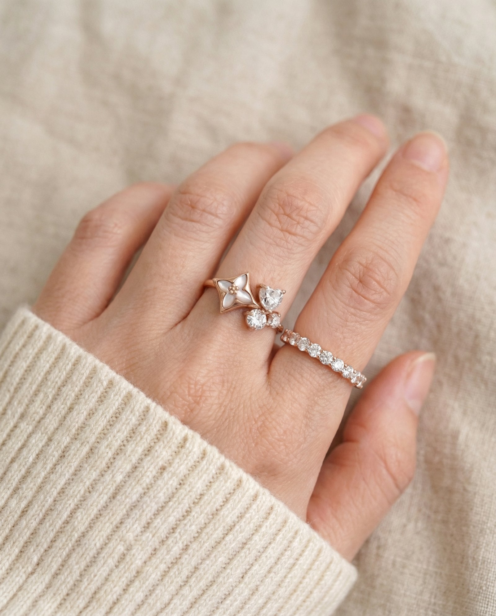 • Stone size: ~3 mm & ~4 mm Round Moisssanite, ~5 mm Heart Moissanite, ~7.6 mm