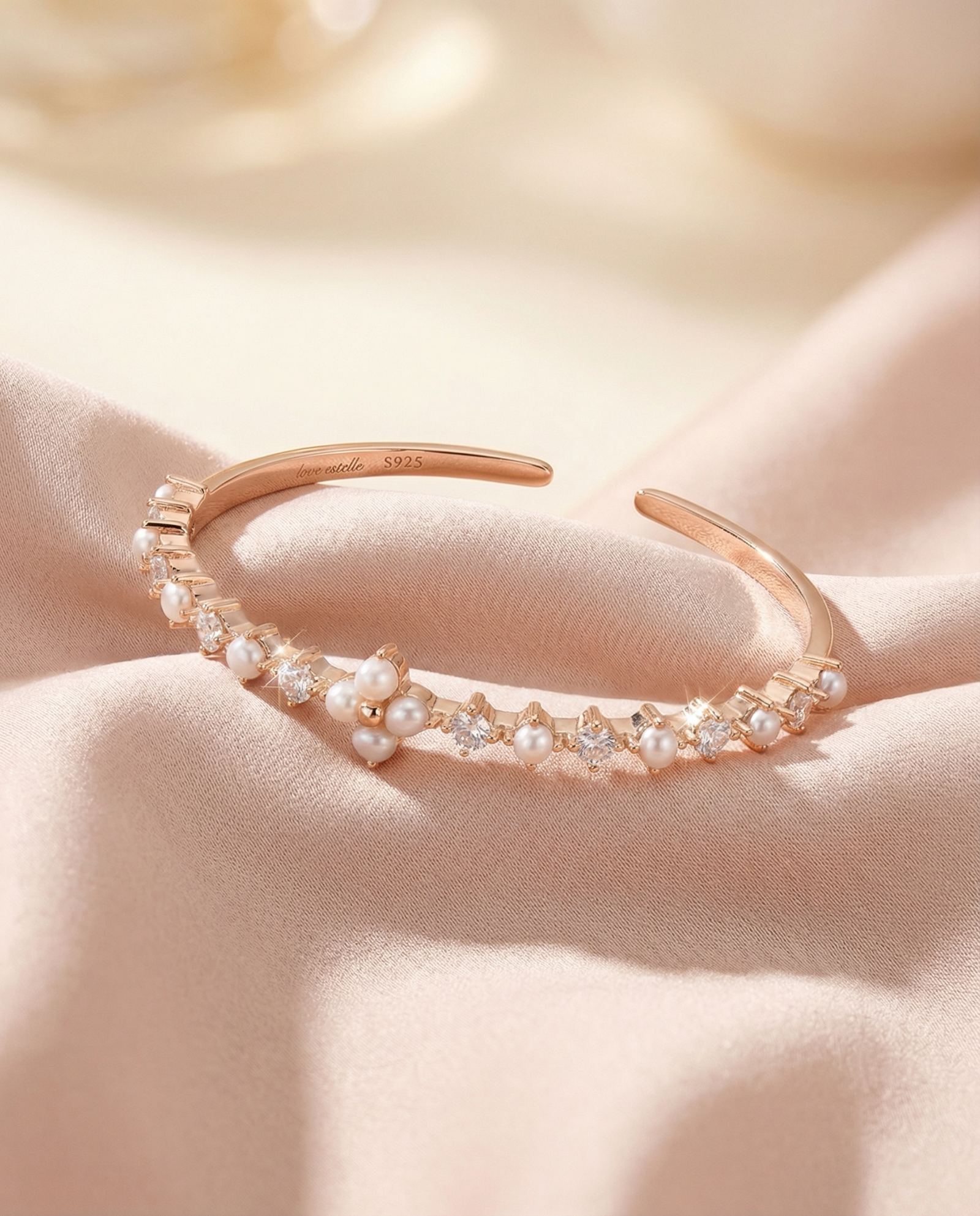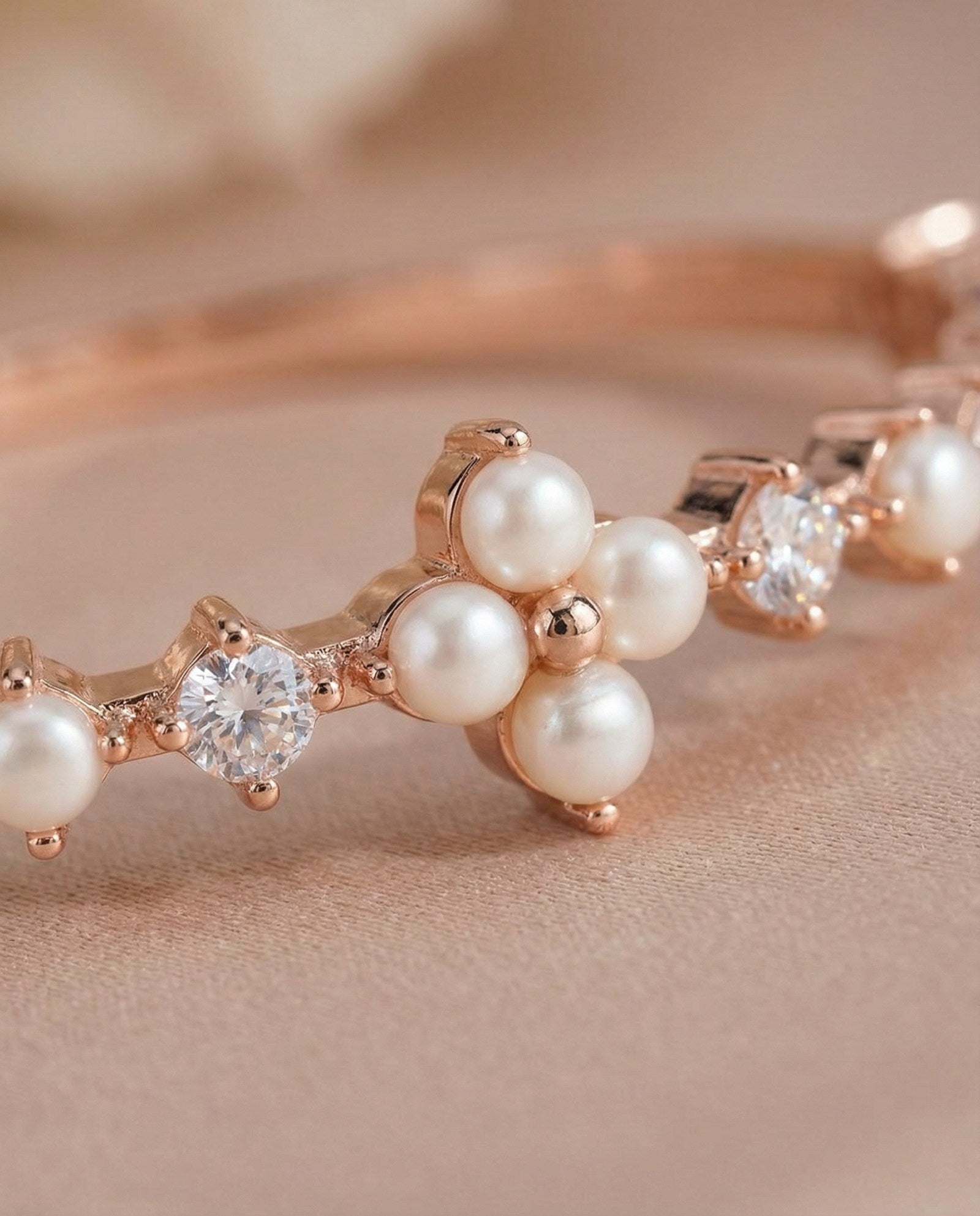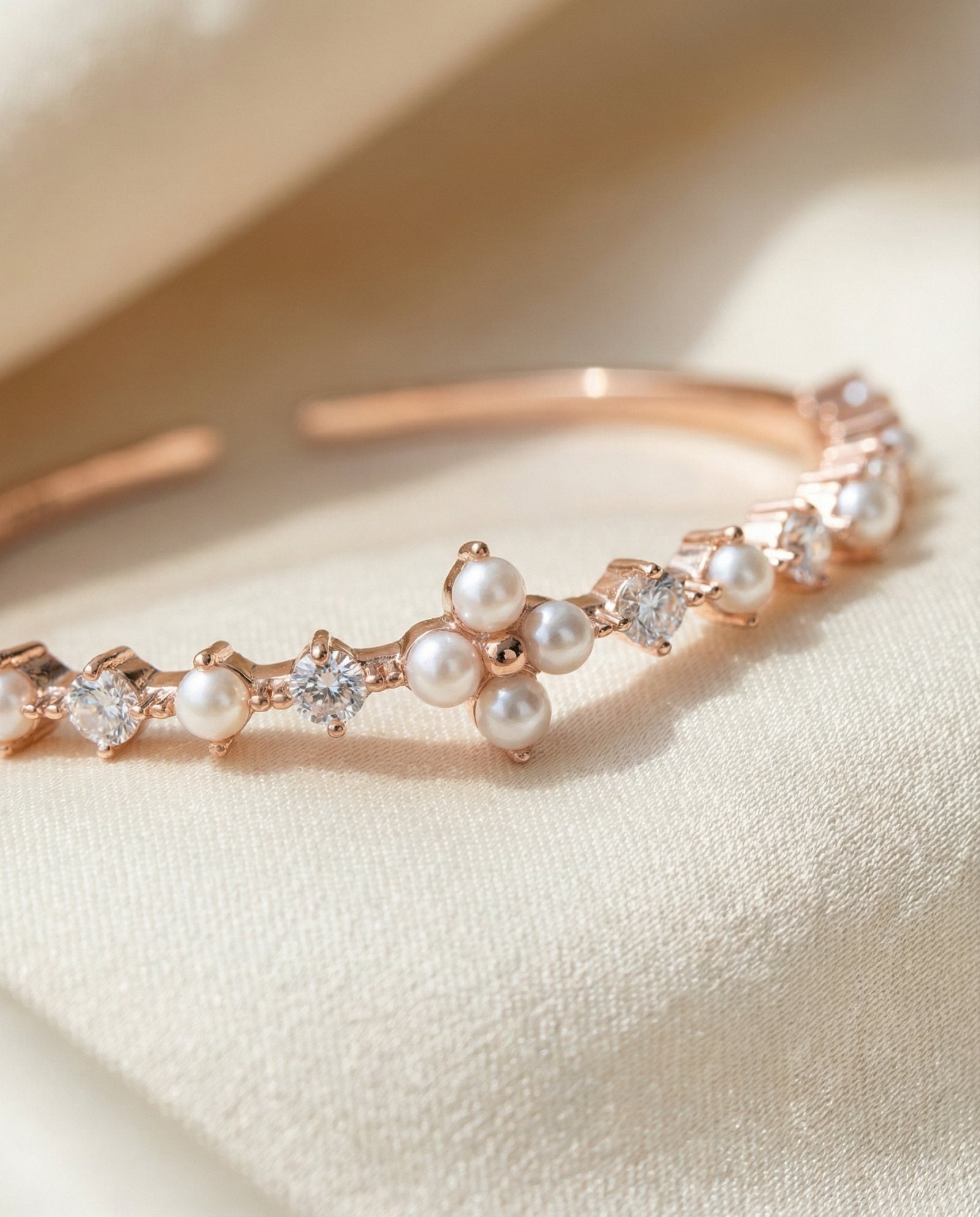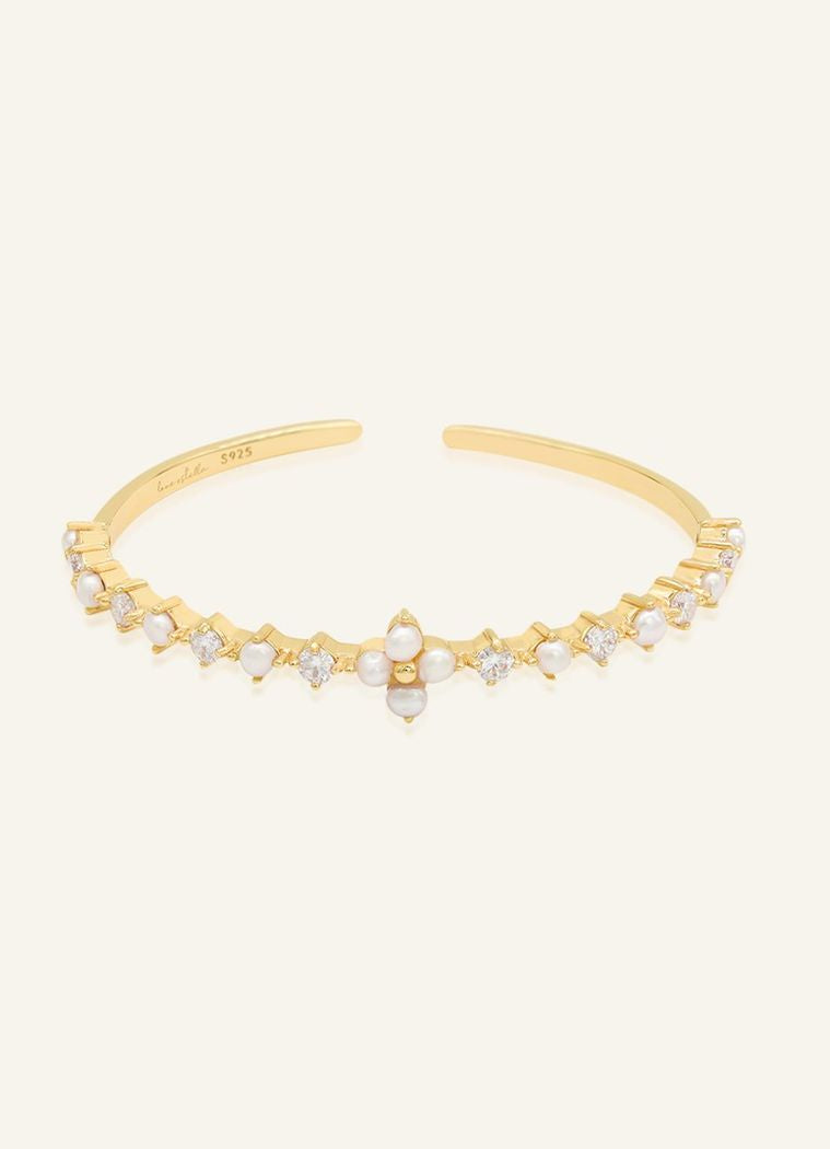 Shine bright, live light - The Clover Sparkle Cuff, dotted with pearls and moissanite magic.