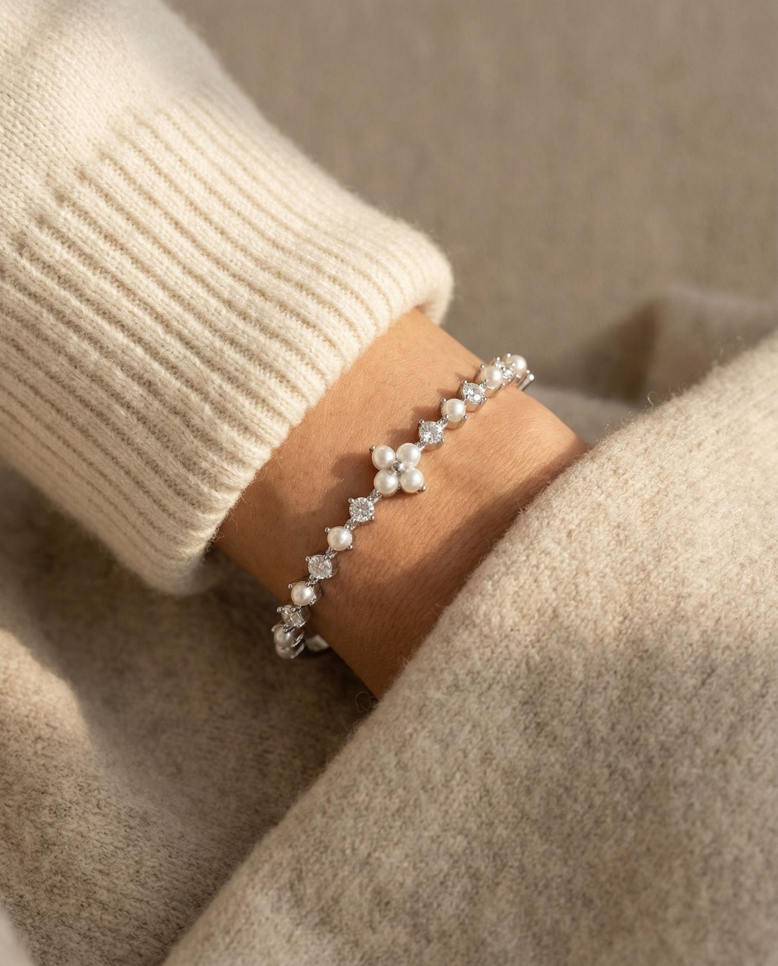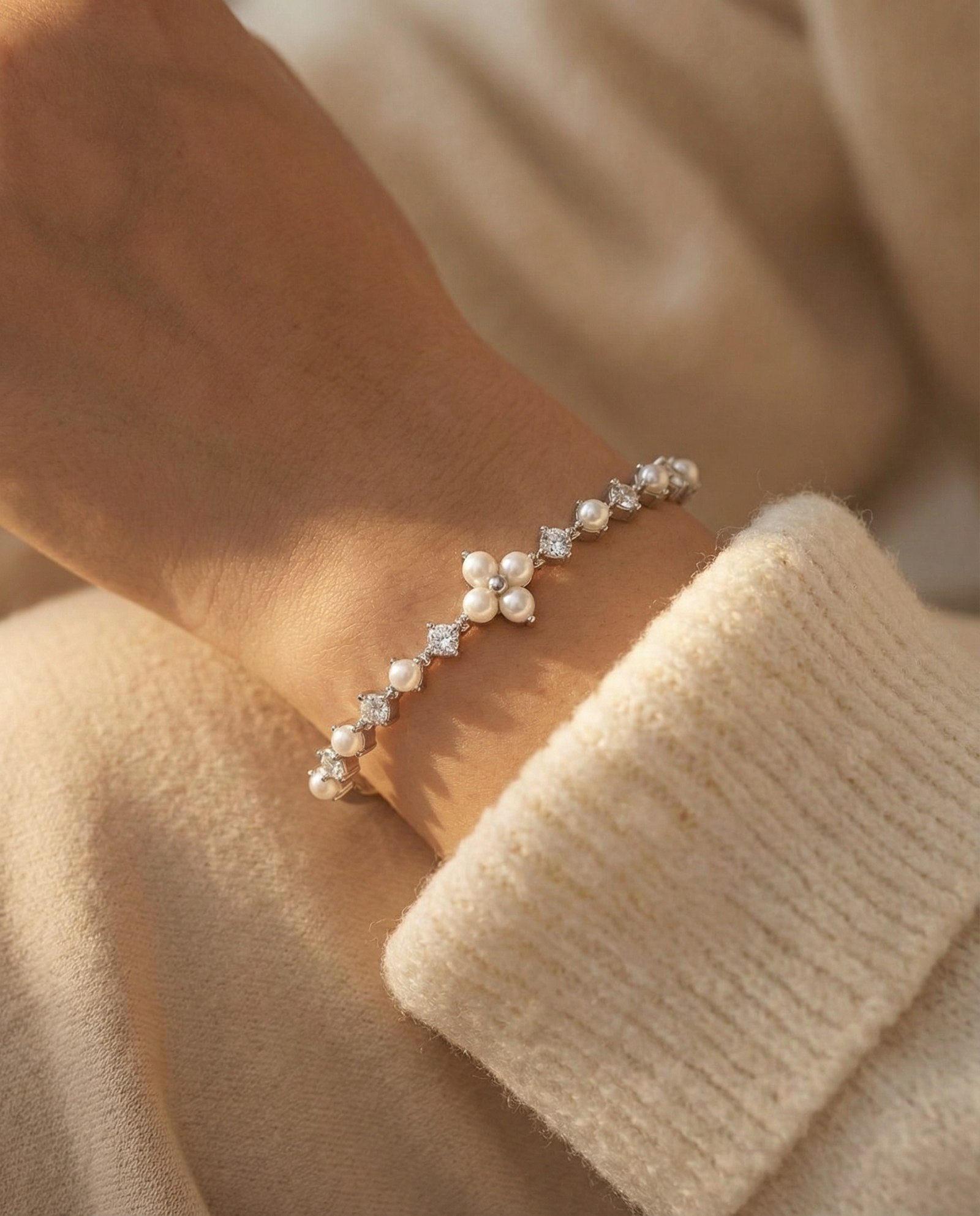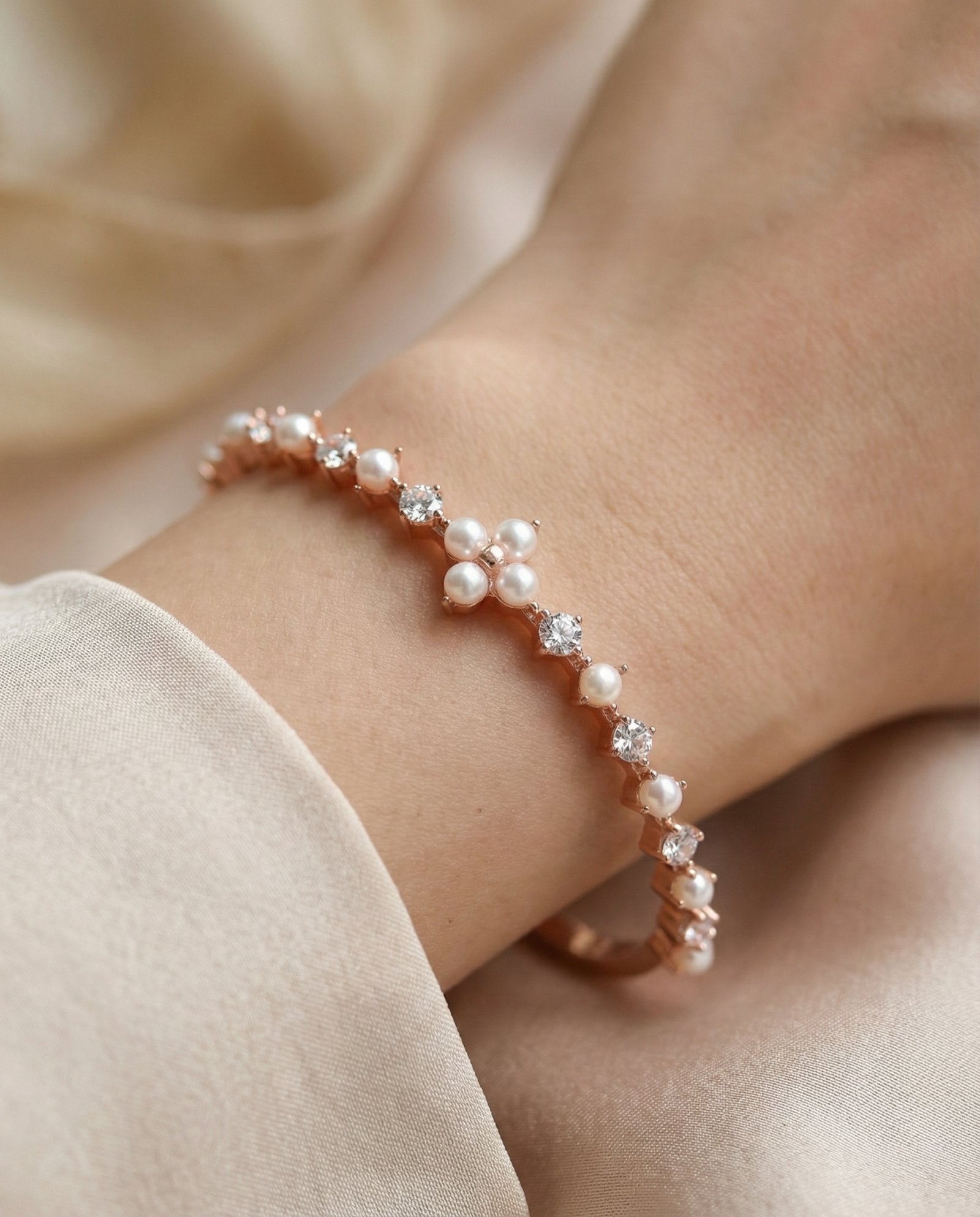 Shine bright, live light - The Clover Sparkle Cuff, dotted with pearls and moissanite magic.