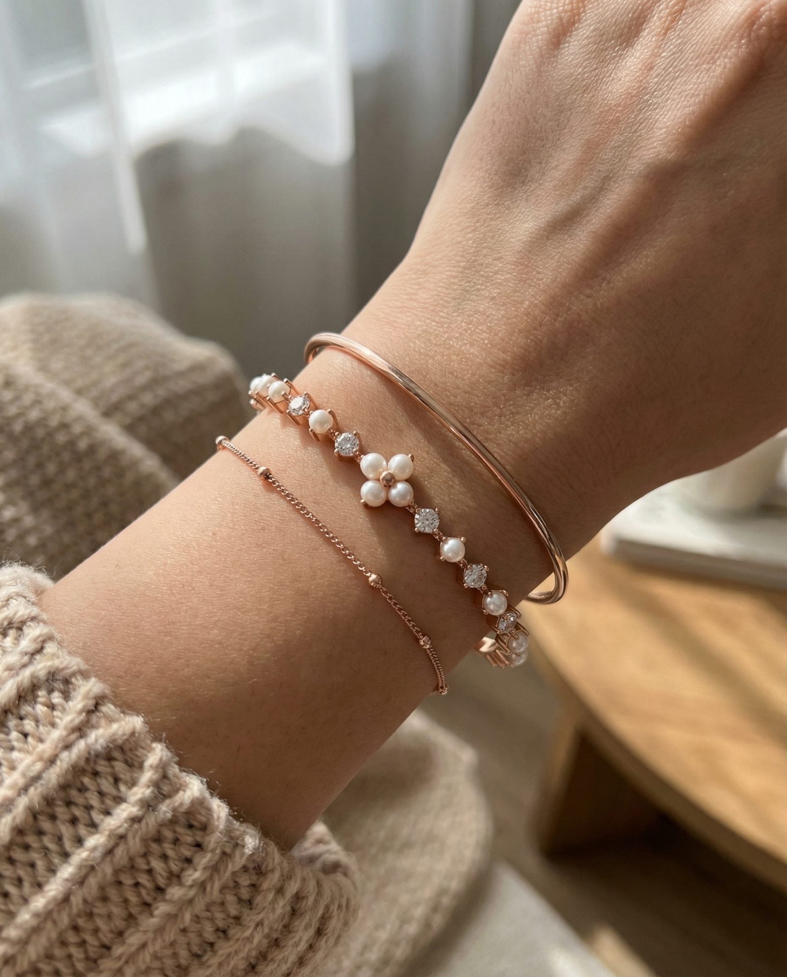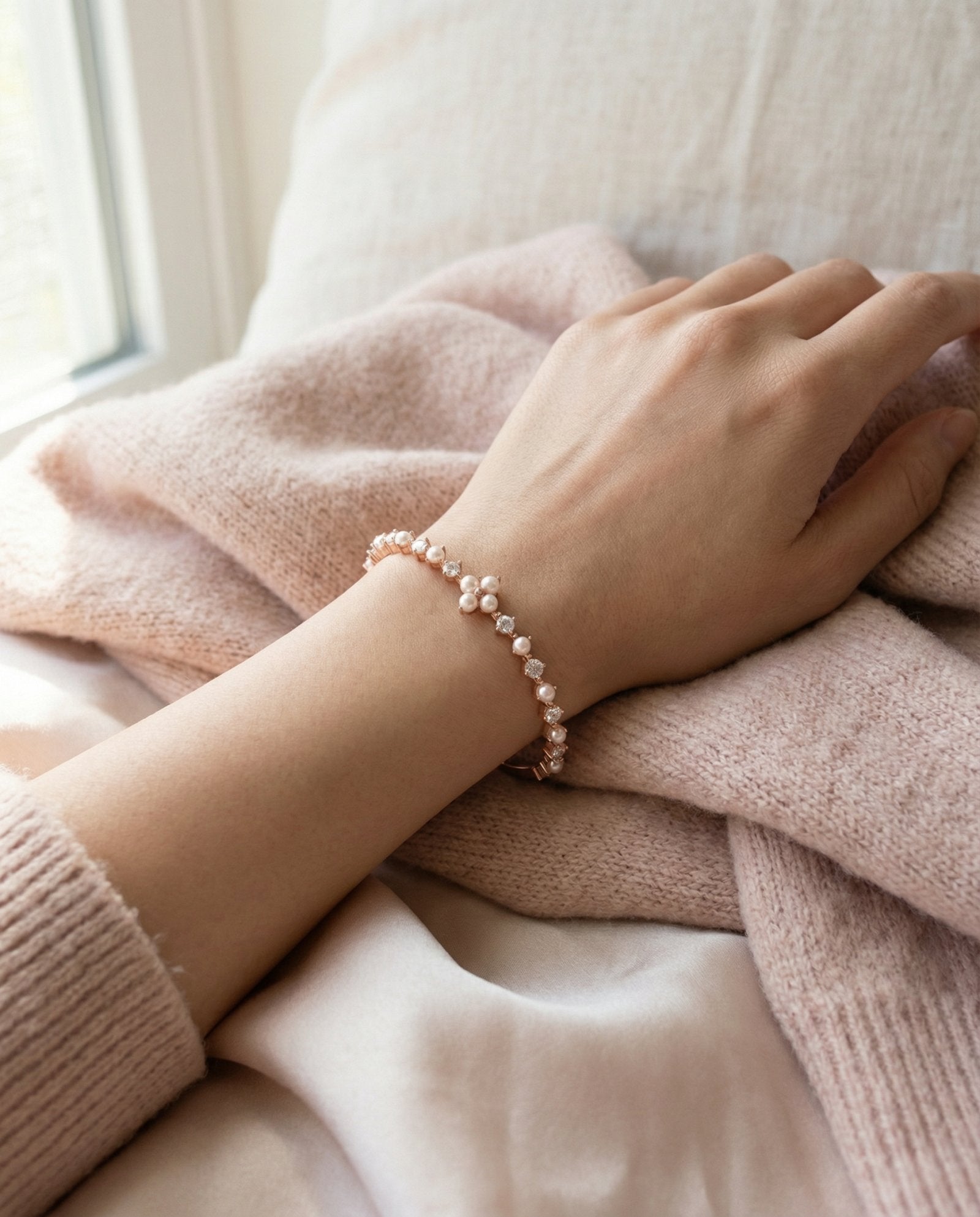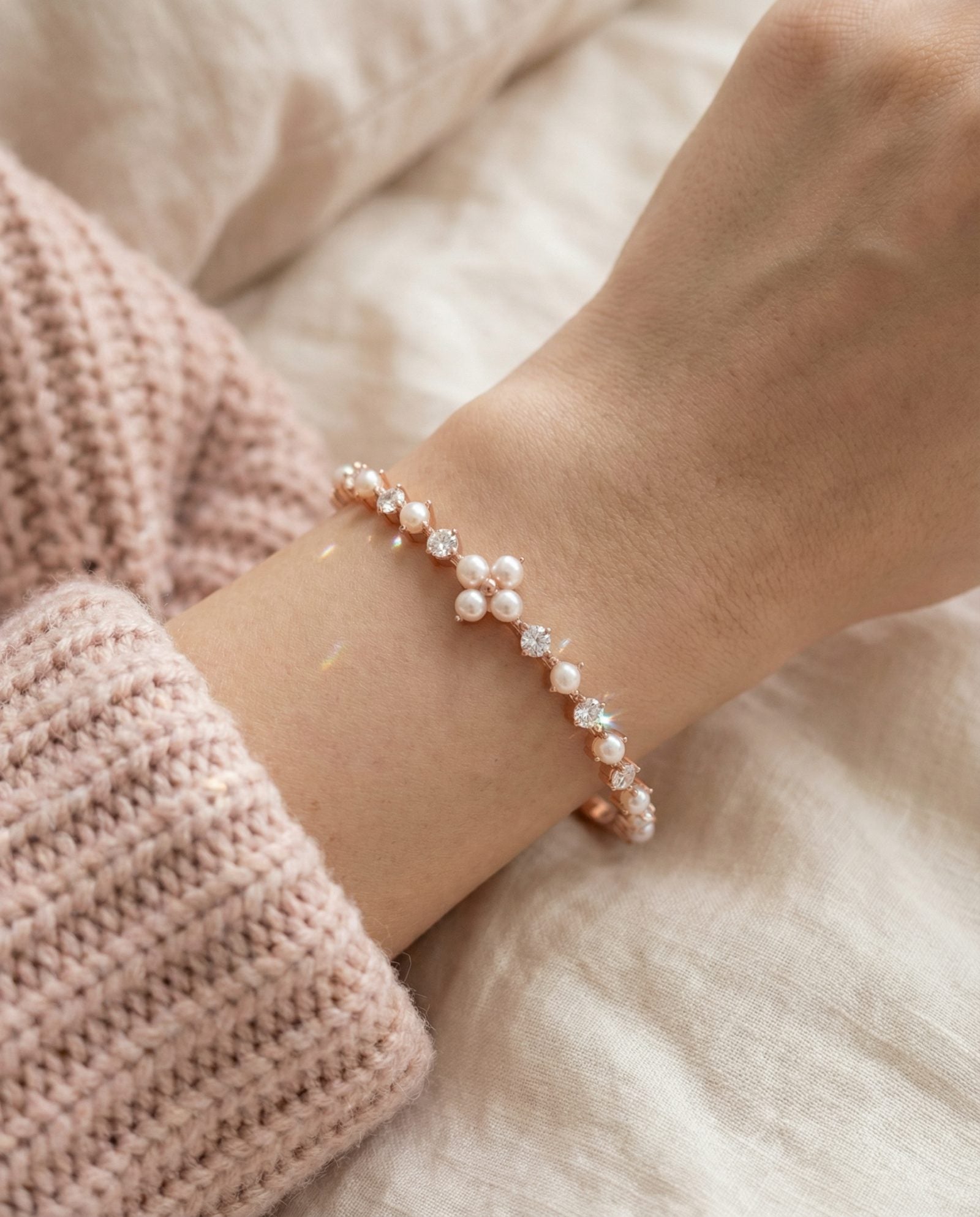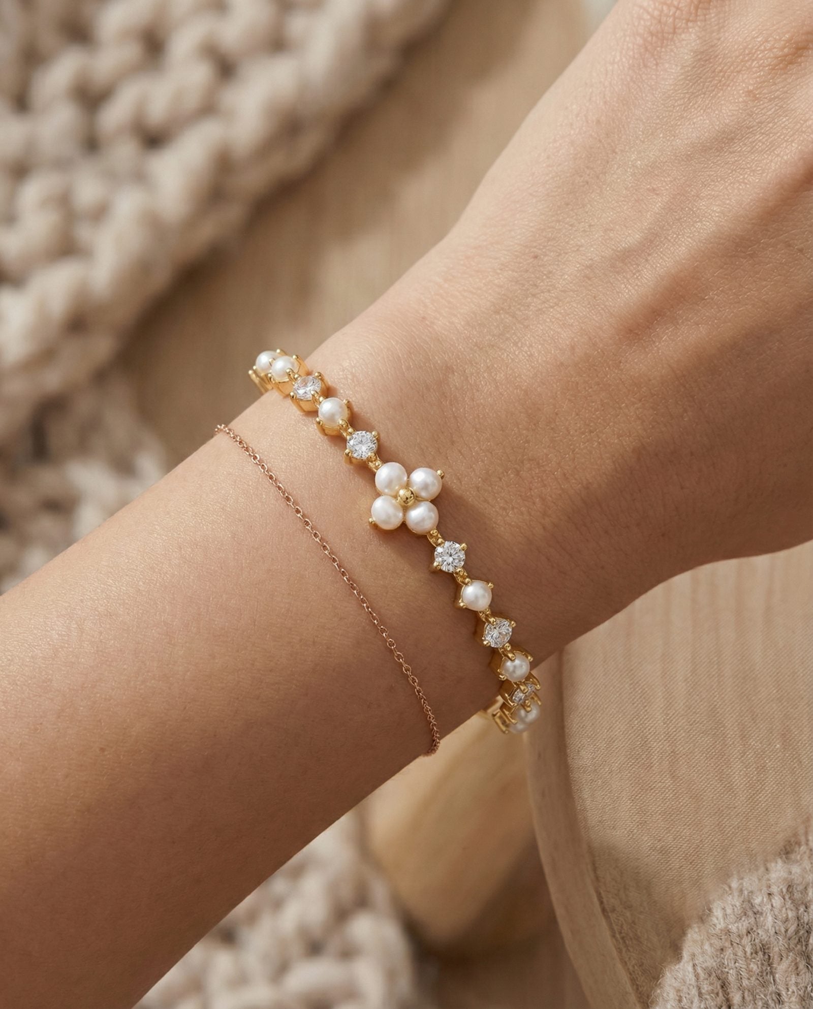 Shine bright, live light - The Clover Sparkle Cuff, dotted with pearls and moissanite magic.