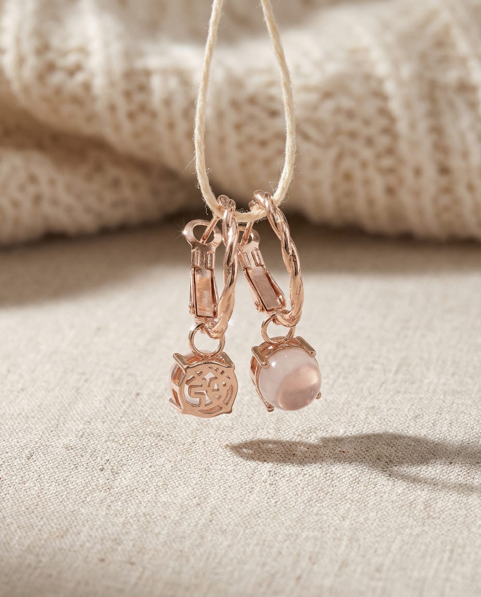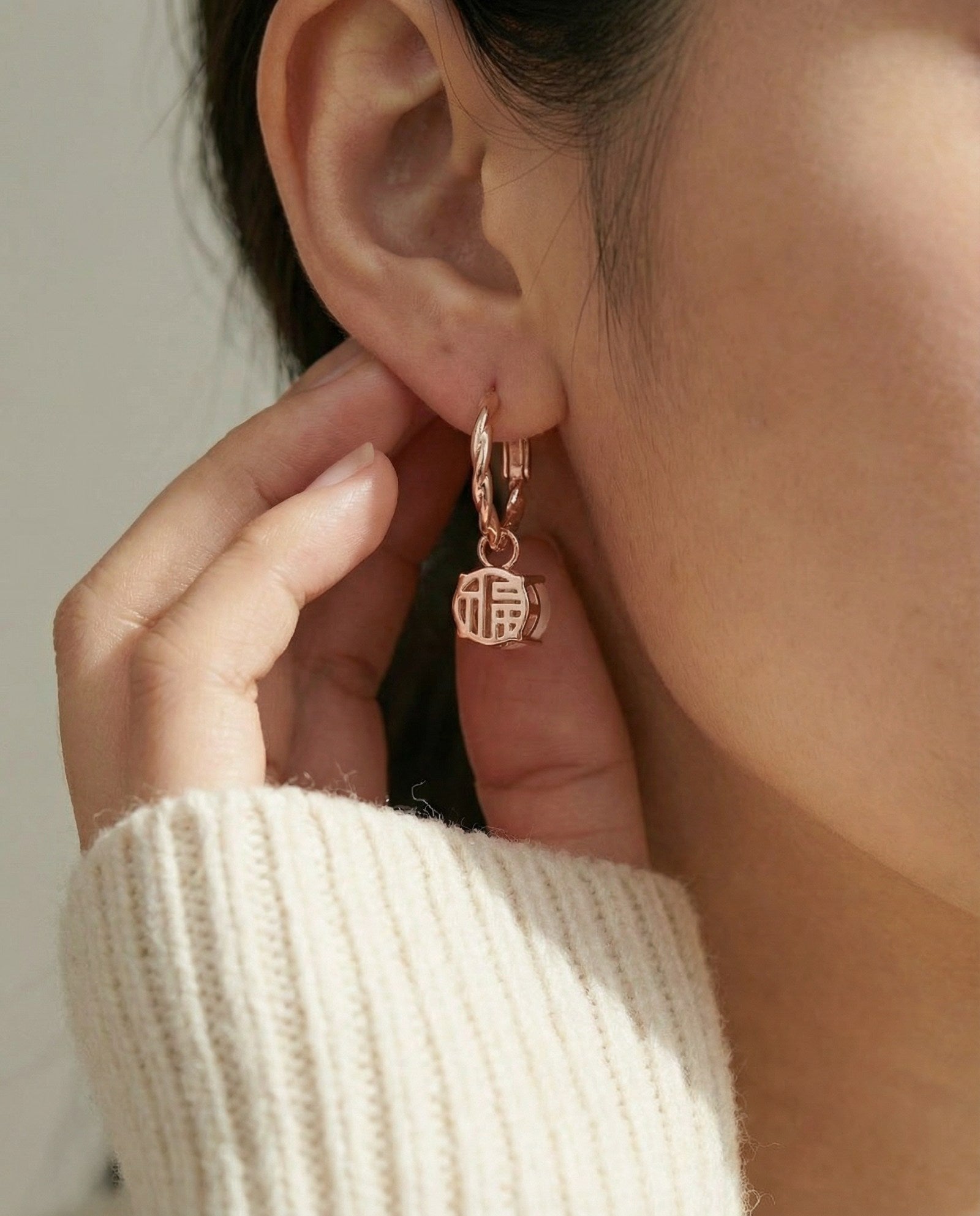 • Dangling Elements: Each hoop has a dangling rose quartz gemstone, encased in a decorative setting with the Chinese characters “福” (fu) for fortune and “发” (fa) for prosperity, symbolizing good luck and wealth.
