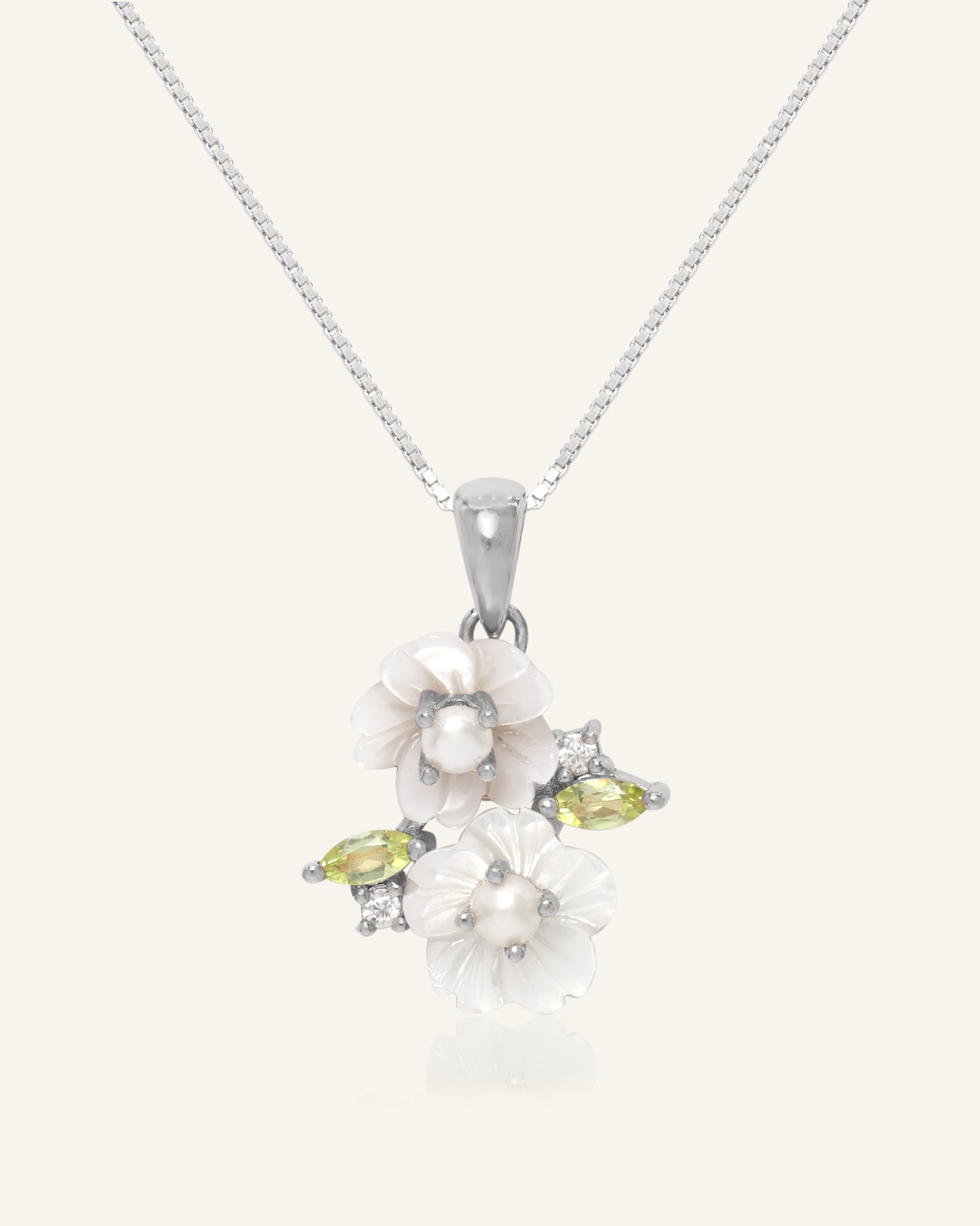 • Handcarved Mother of Pearl, Freshwater Pearl & Peridot