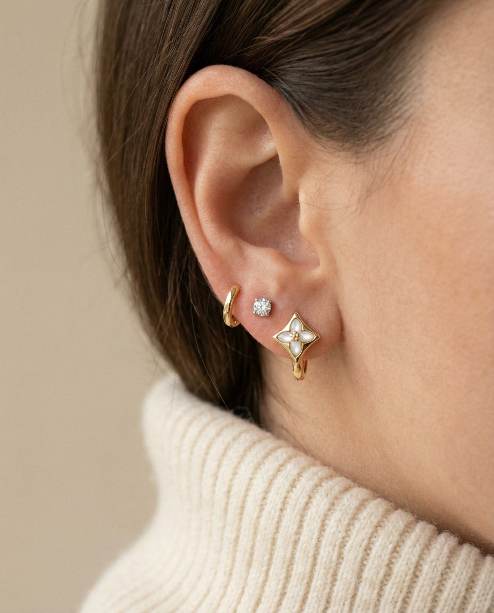 Bring a little luck to your lobes 🍀✨ Our Clover Monogram Huggies are the perfect blend of elegance and charm, designed to keep you stylishly lucky all day long!