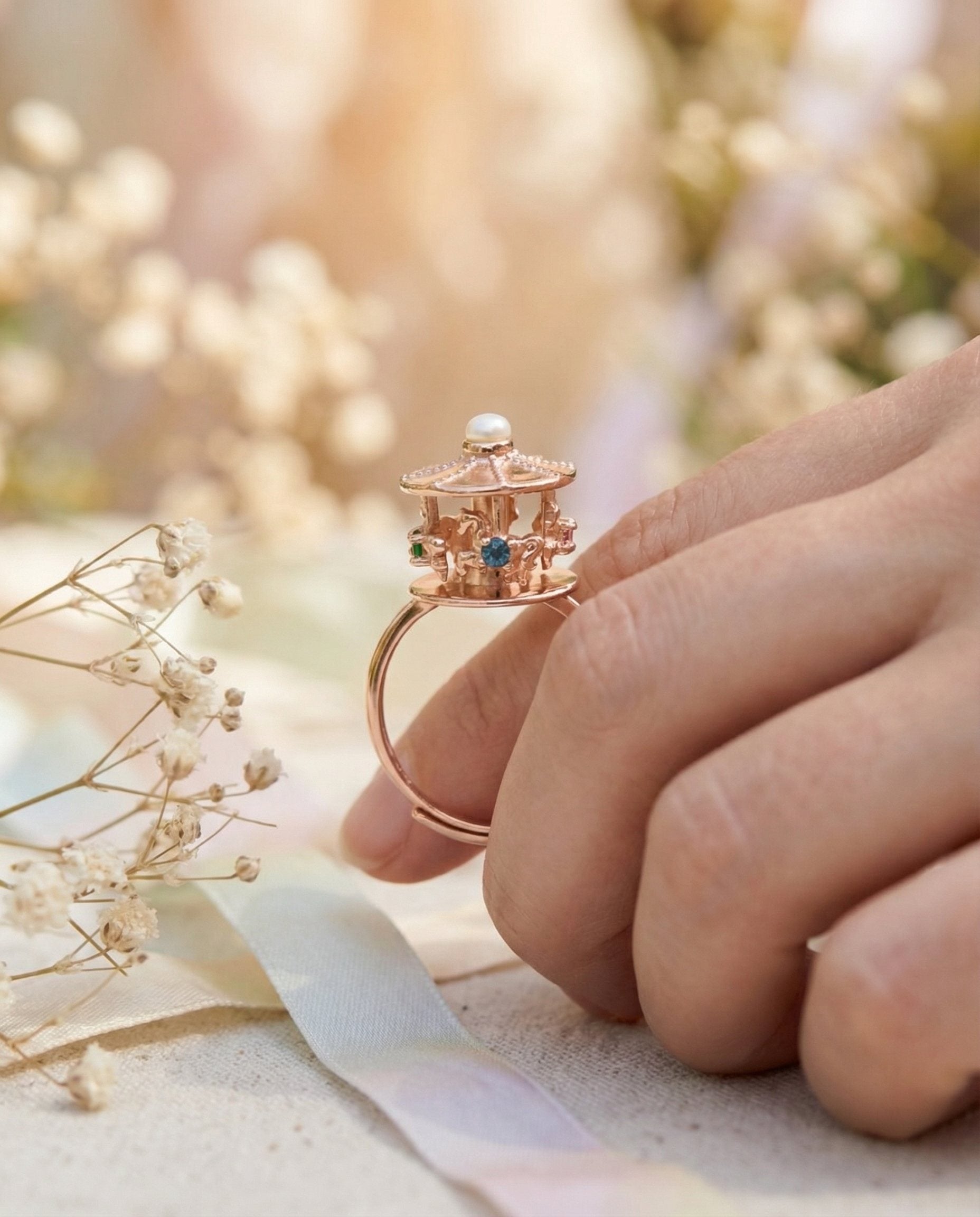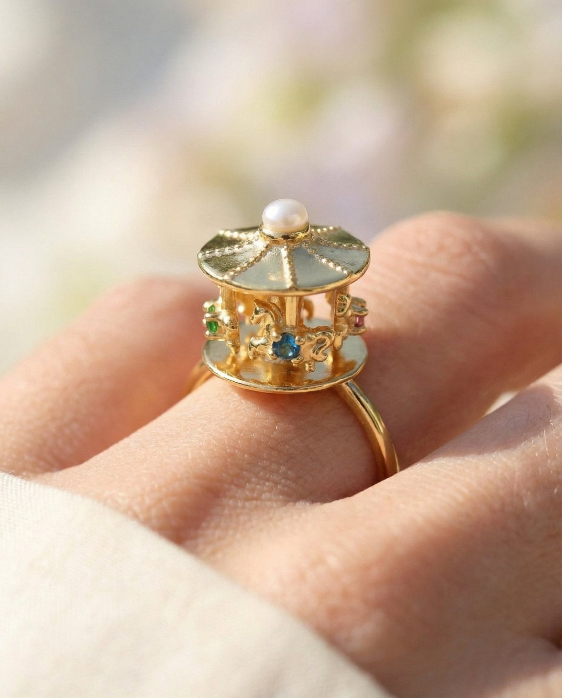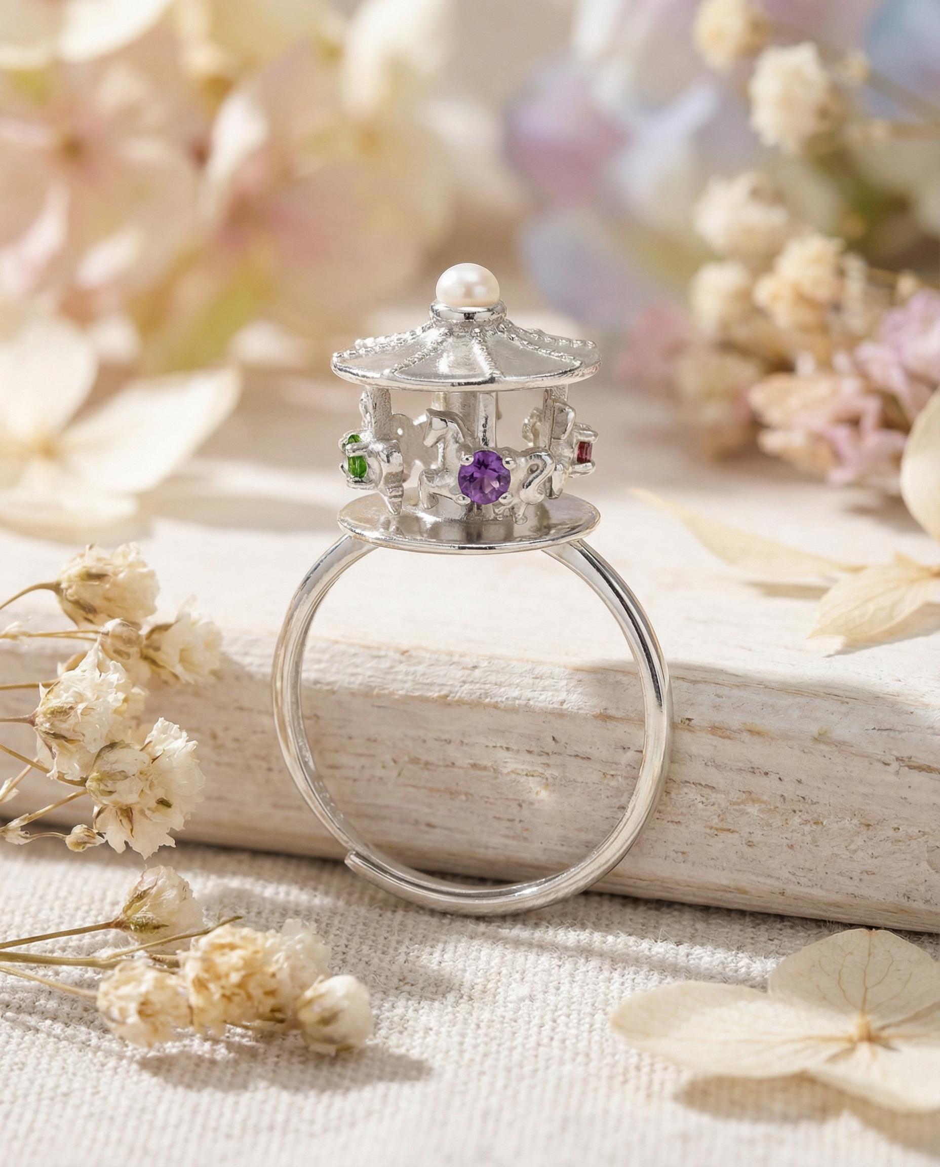 This enchanting ring captures the magic of a whimsical spinning carousel, bringing a touch of childhood wonder to your everyday style. The intricate carousel design features delightful details that evoke the charm and joy of a fairytale moment.