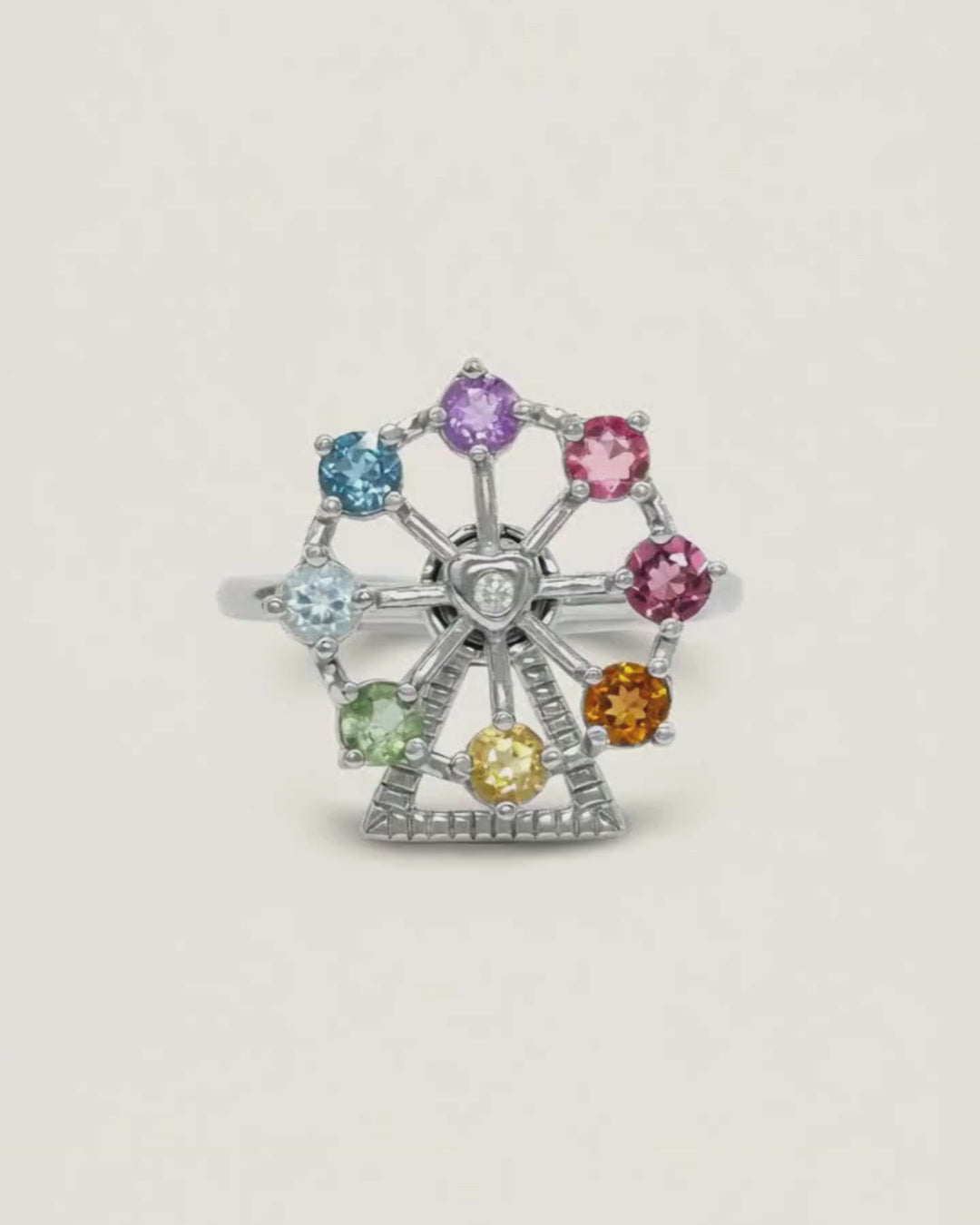 A miniature Ferris wheel ring set with natural semi-precious gemstones, designed with a fully movable center that rotates smoothly.