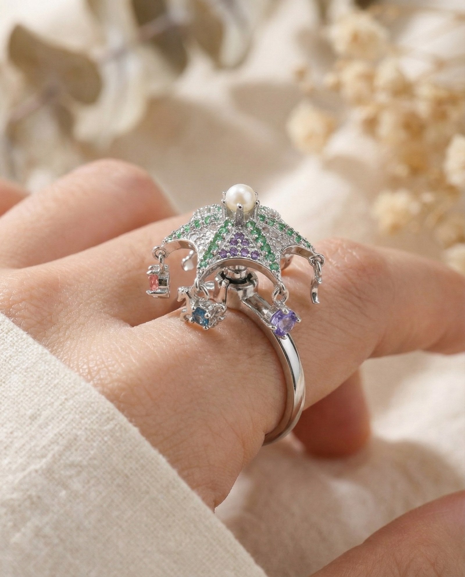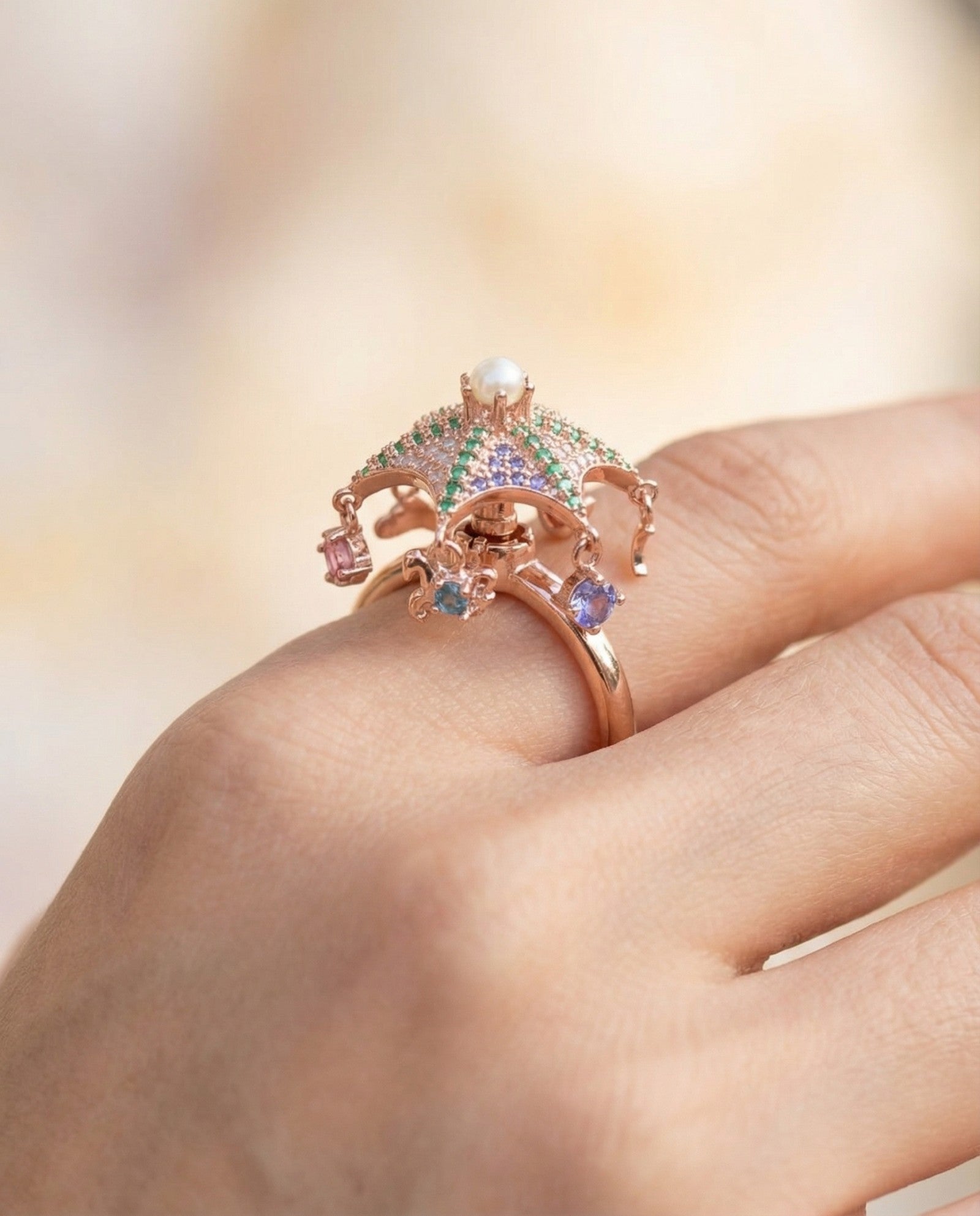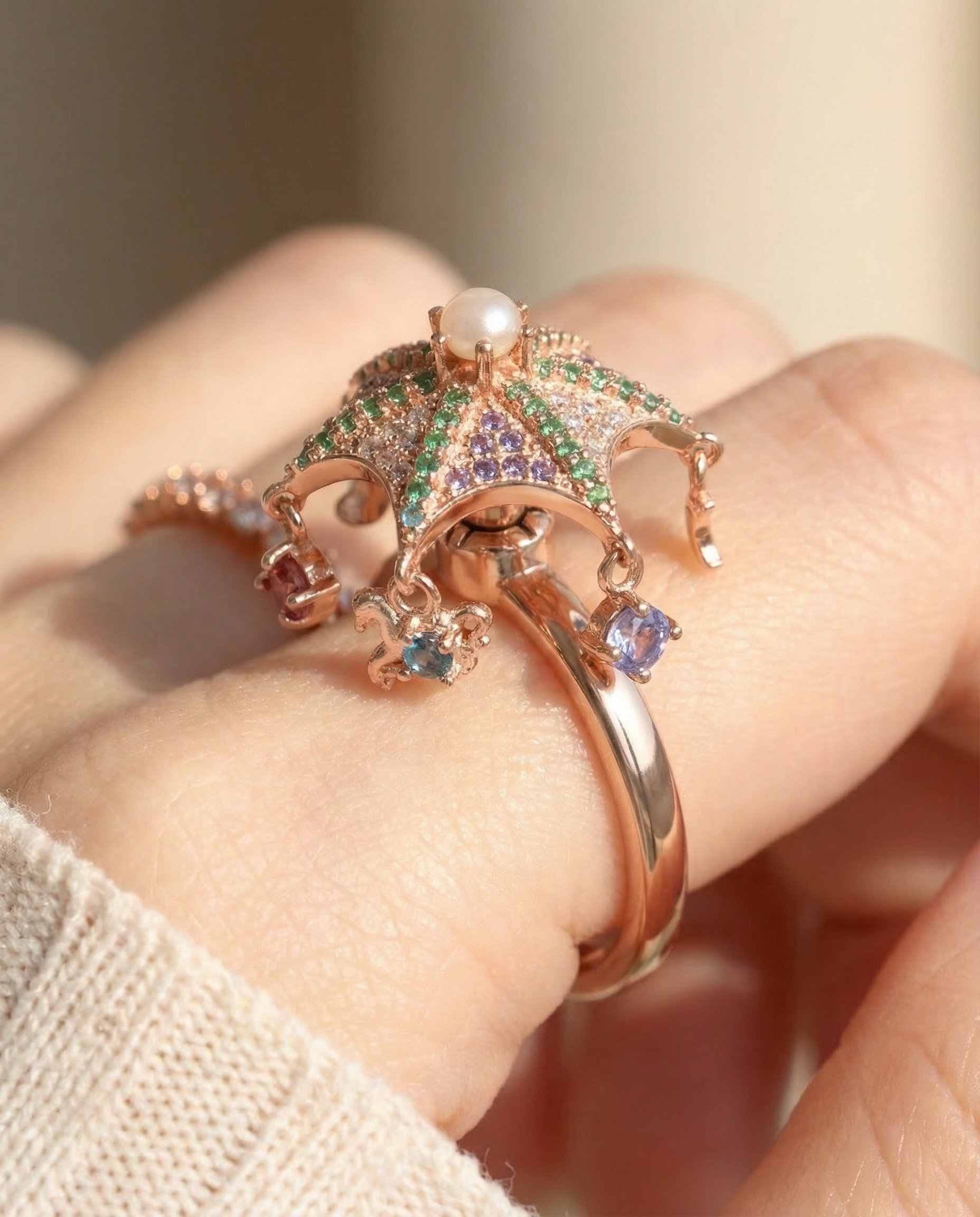 Our Merry-Go-Round Ring is a playful spin with dangles like a carousel horse, cloud, and heart, all sprinkled with sparkles. Round and round in style! 🎠✨