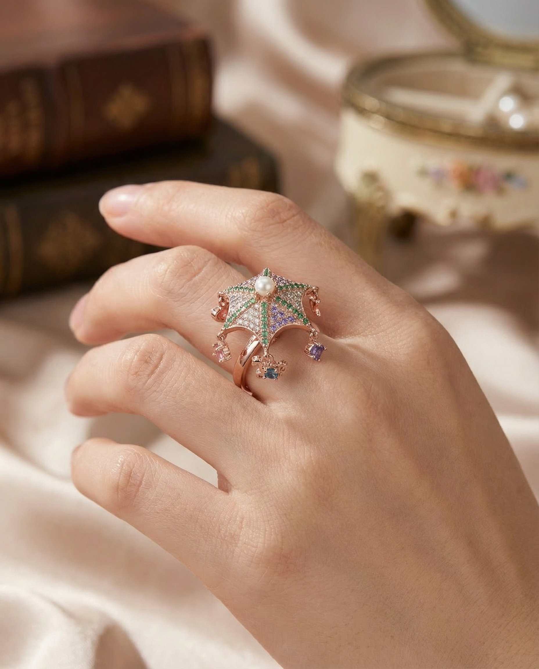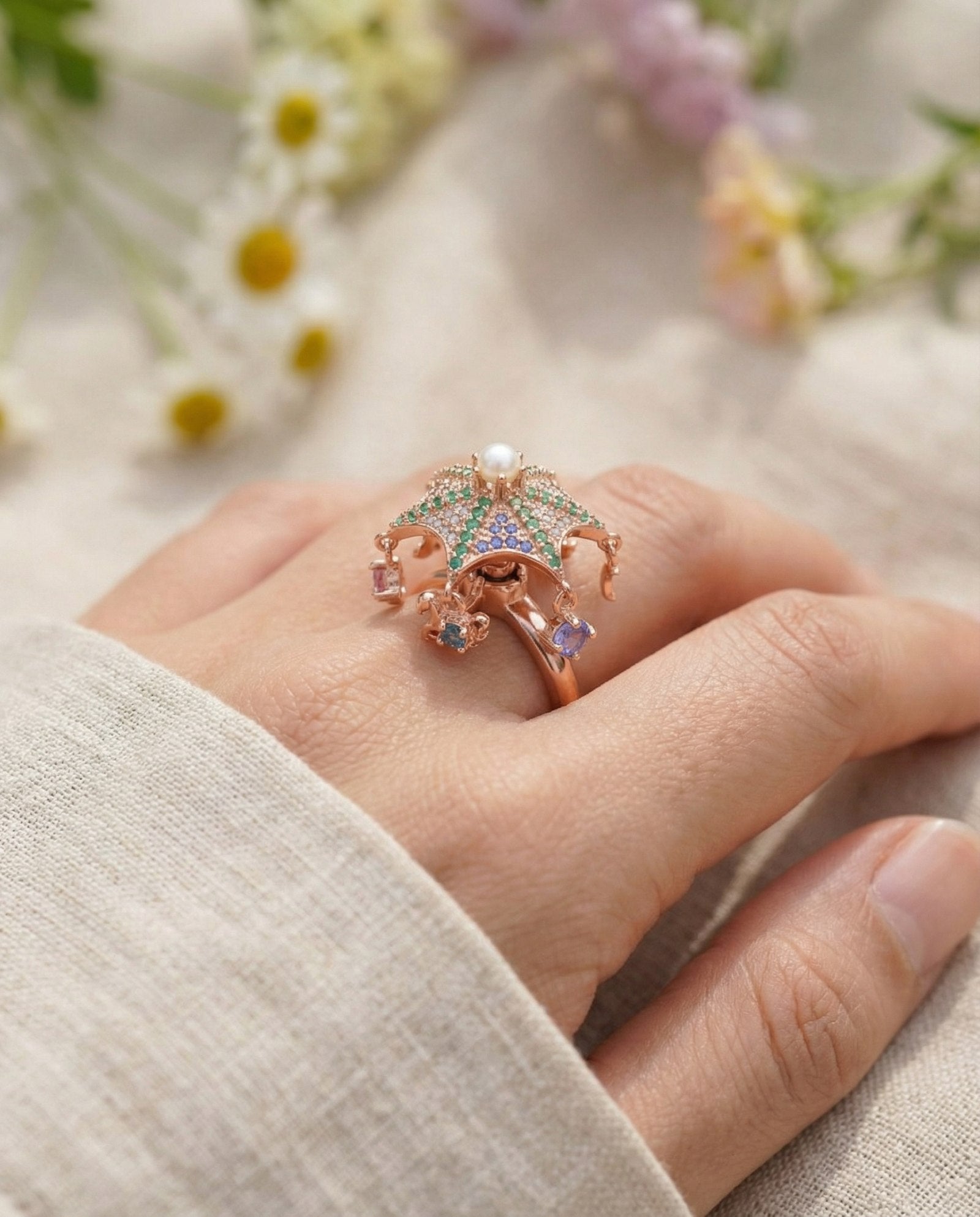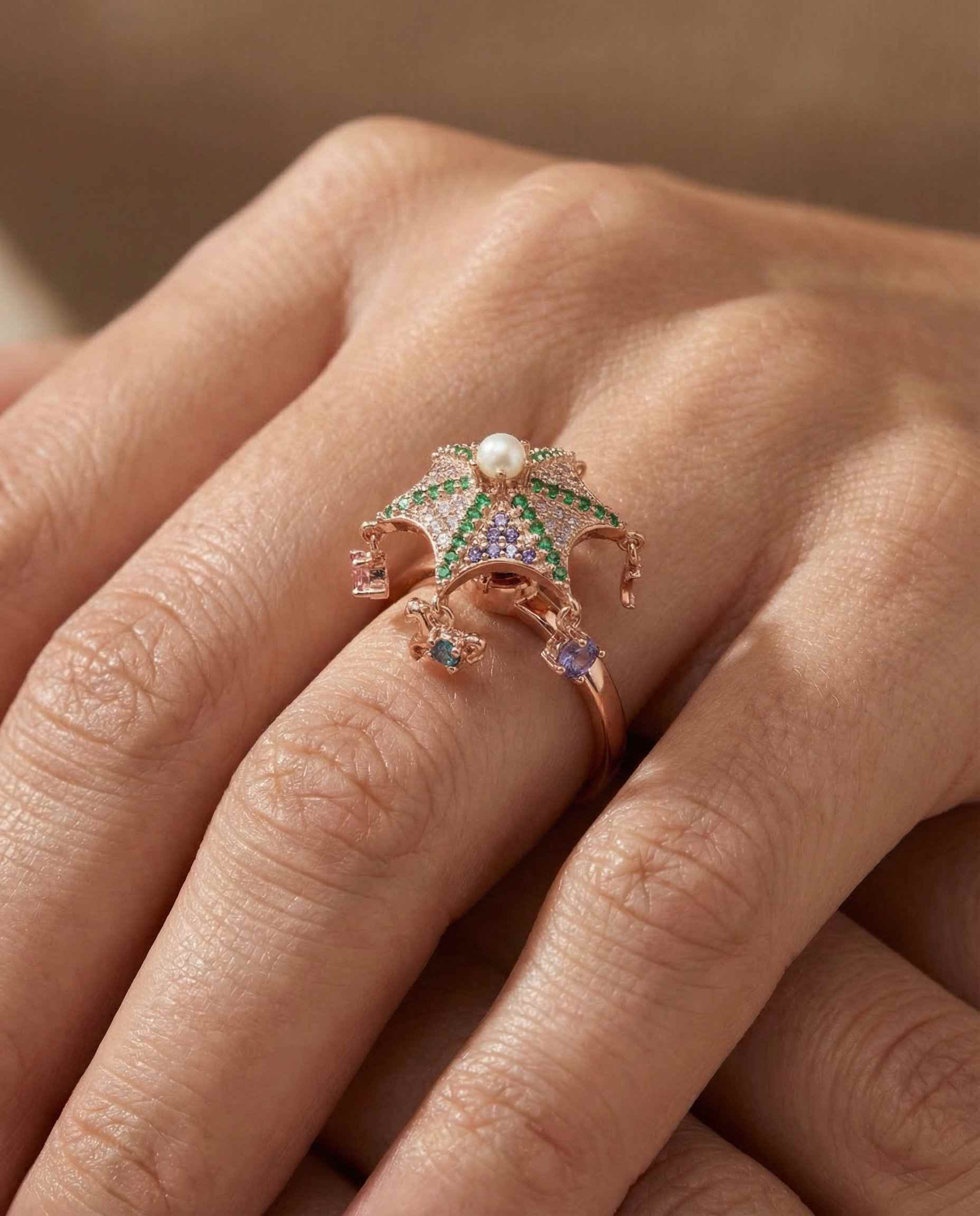 Our Merry-Go-Round Ring is a playful spin with dangles like a carousel horse, cloud, and heart, all sprinkled with sparkles. Round and round in style! 🎠✨