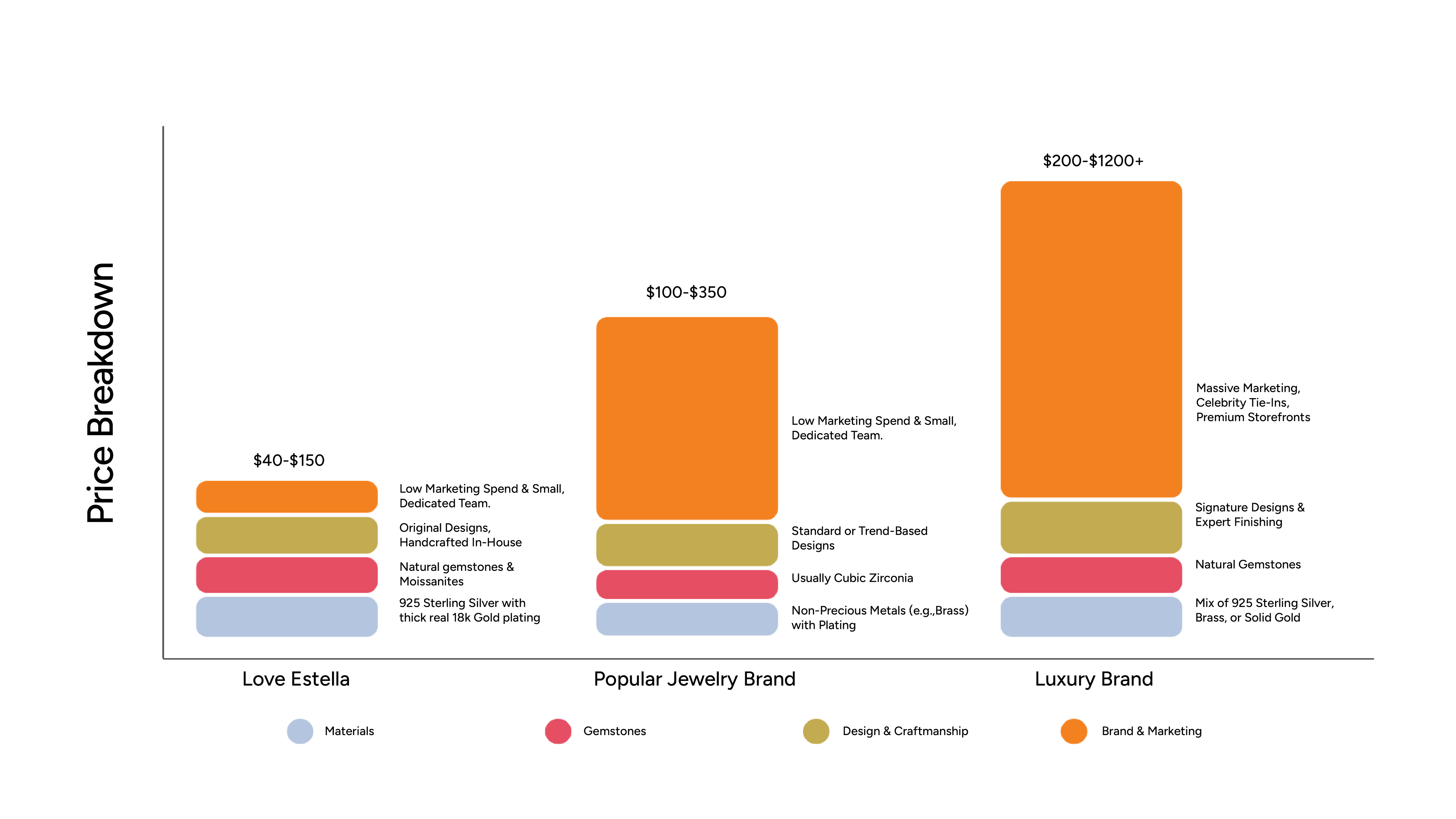 That’s why we keep things transparent: no inflated markups, no shortcuts on materials. Just genuine designs made with 18k gold-plated 925 silver, natural gemstones, moissanites, and pearls - crafted to last and bring joy.