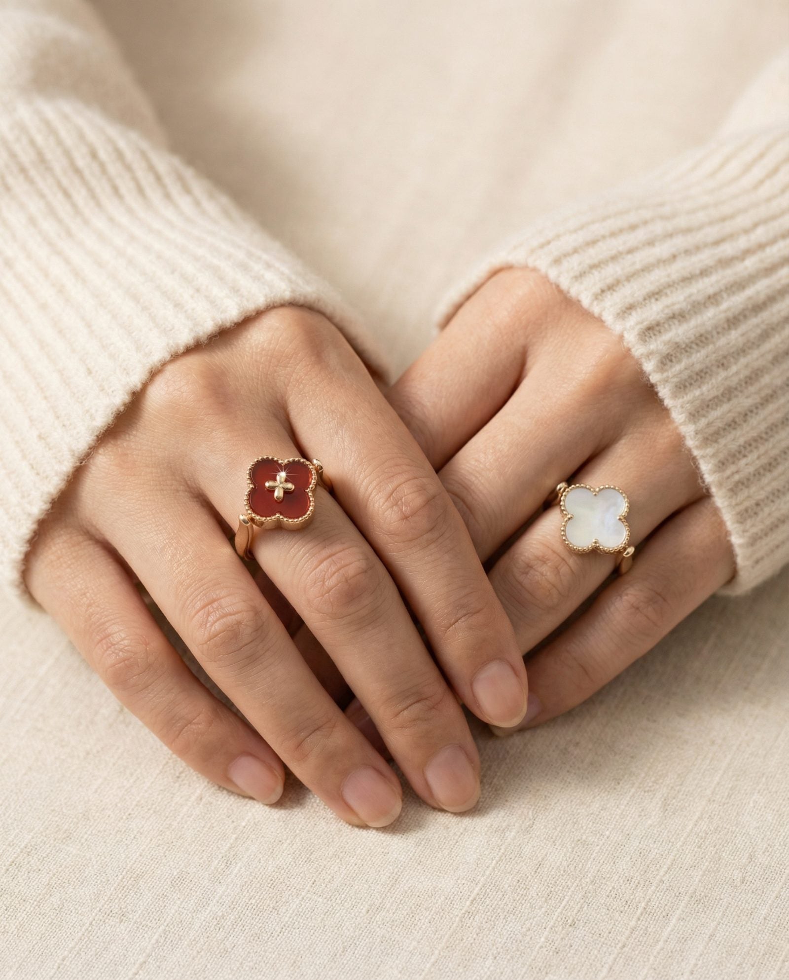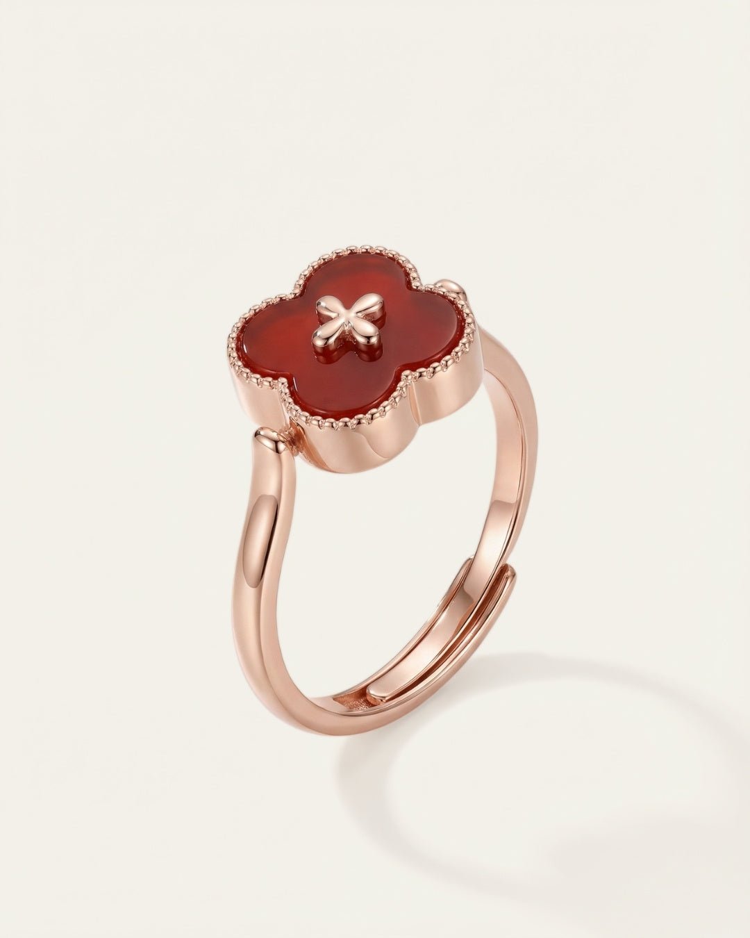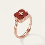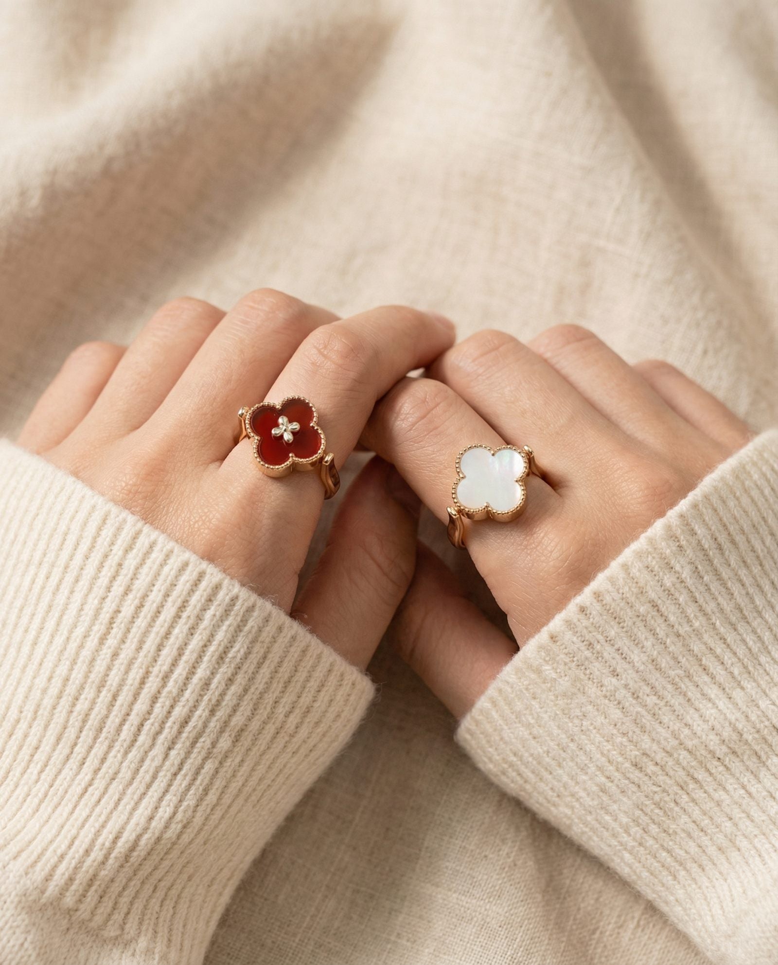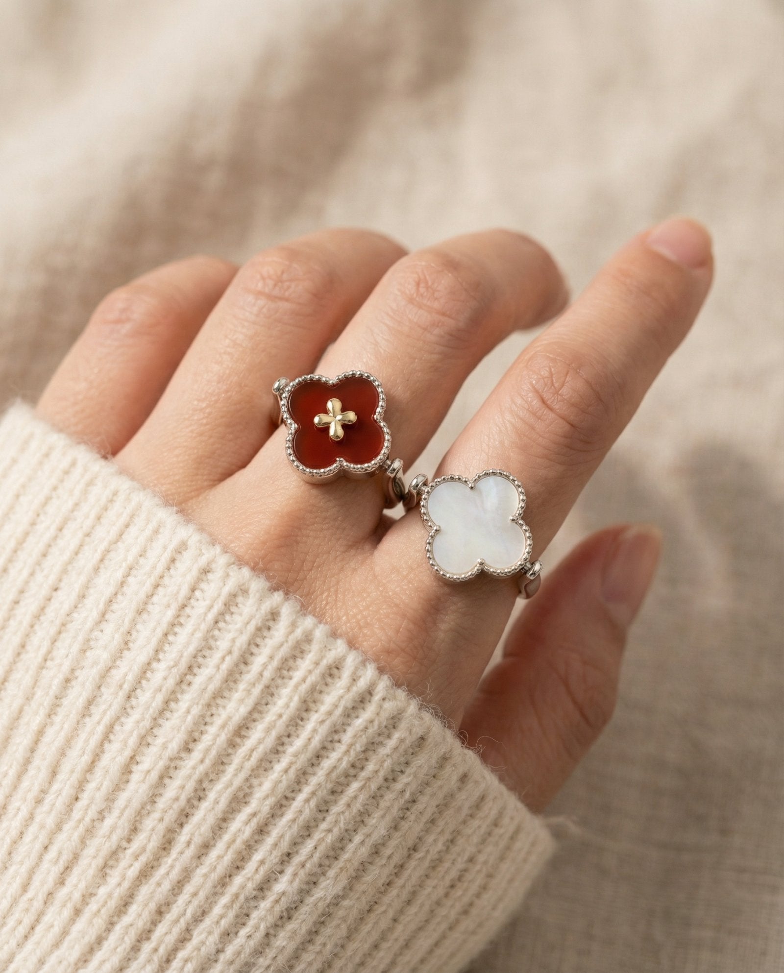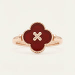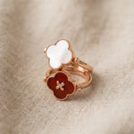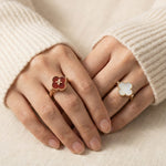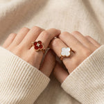 The Clover Flip Ring is designed to be worn both ways. One side features a smooth, full white mother-of-pearl for a soft, luminous look. Flip it over to reveal rich red agate, finished with a tiny clover at its centre, a little extra symbol of luck tucked right where it belongs.