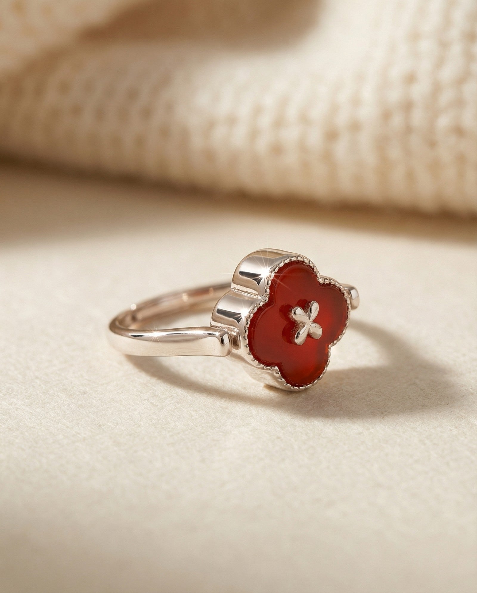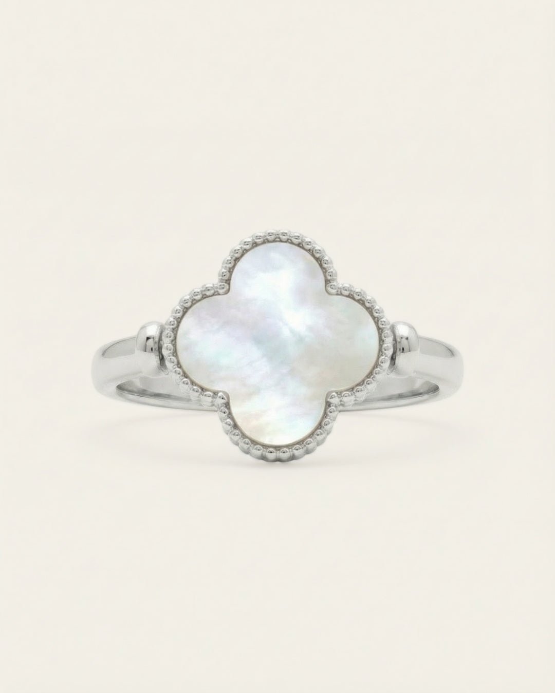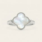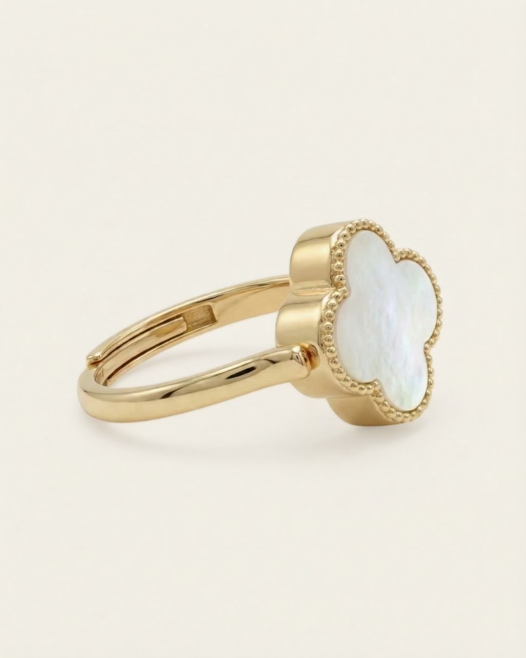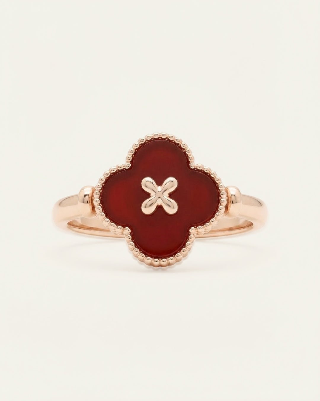 The Clover Flip Ring is designed to be worn both ways. One side features a smooth, full white mother-of-pearl for a soft, luminous look. Flip it over to reveal rich red agate, finished with a tiny clover at its centre, a little extra symbol of luck tucked right where it belongs.