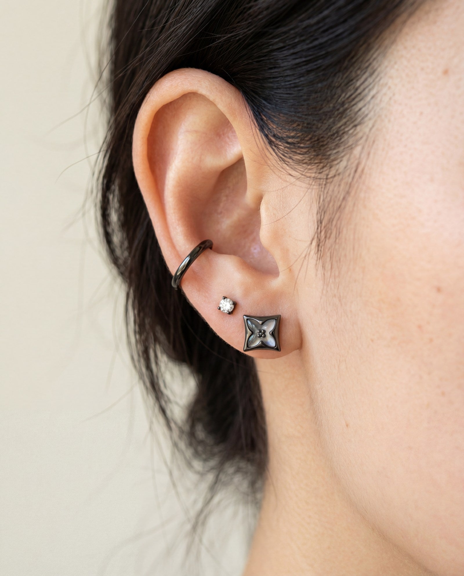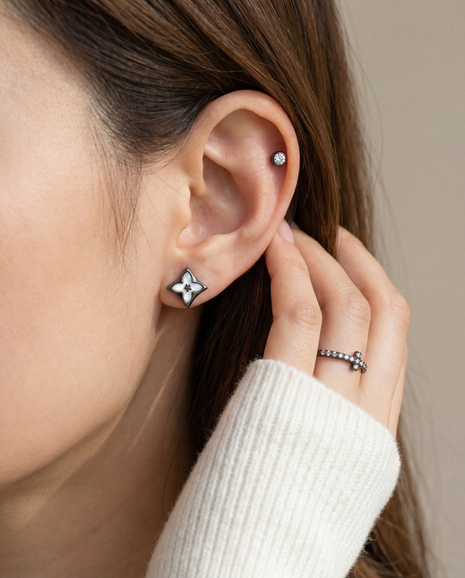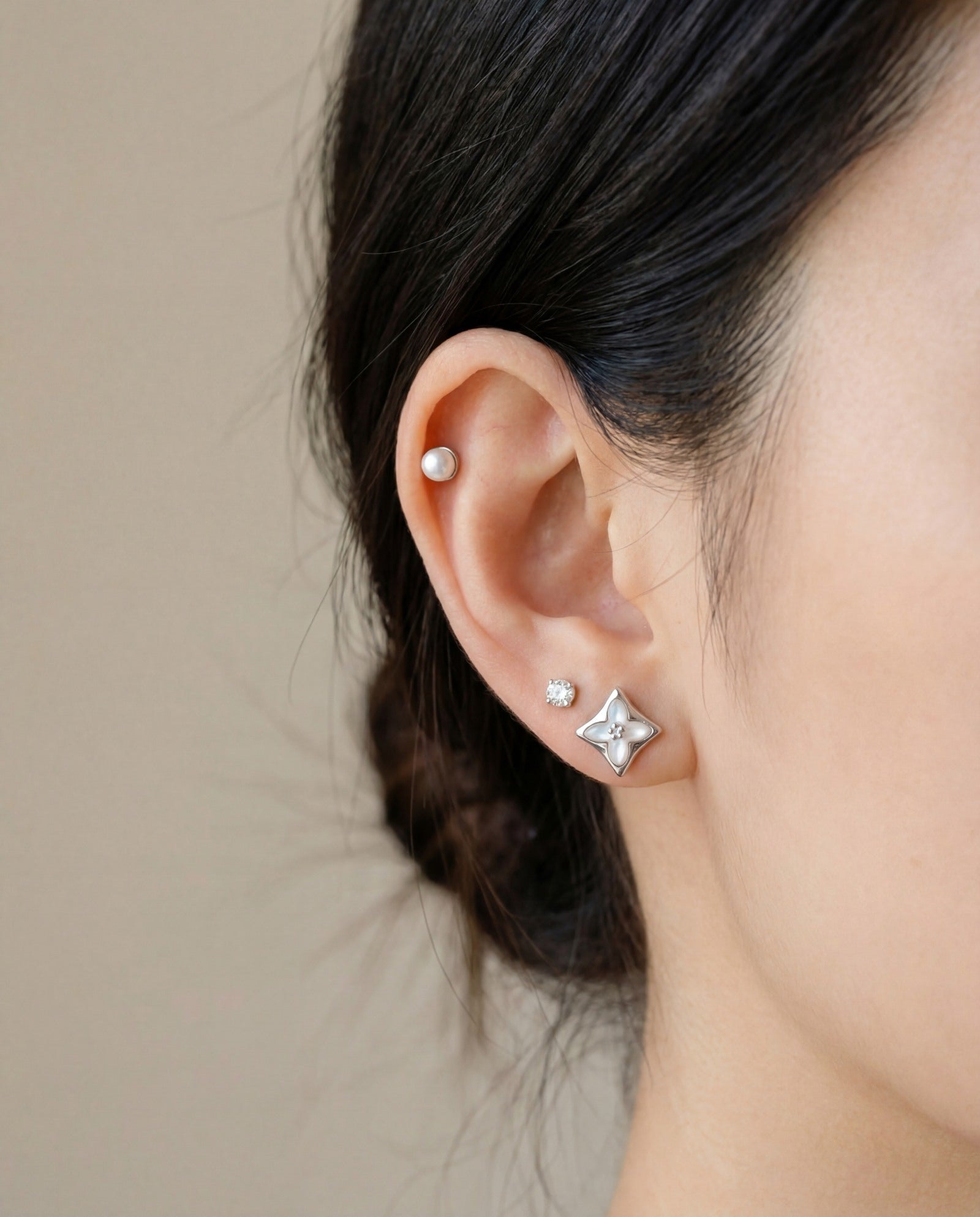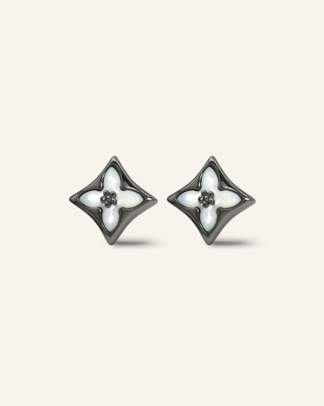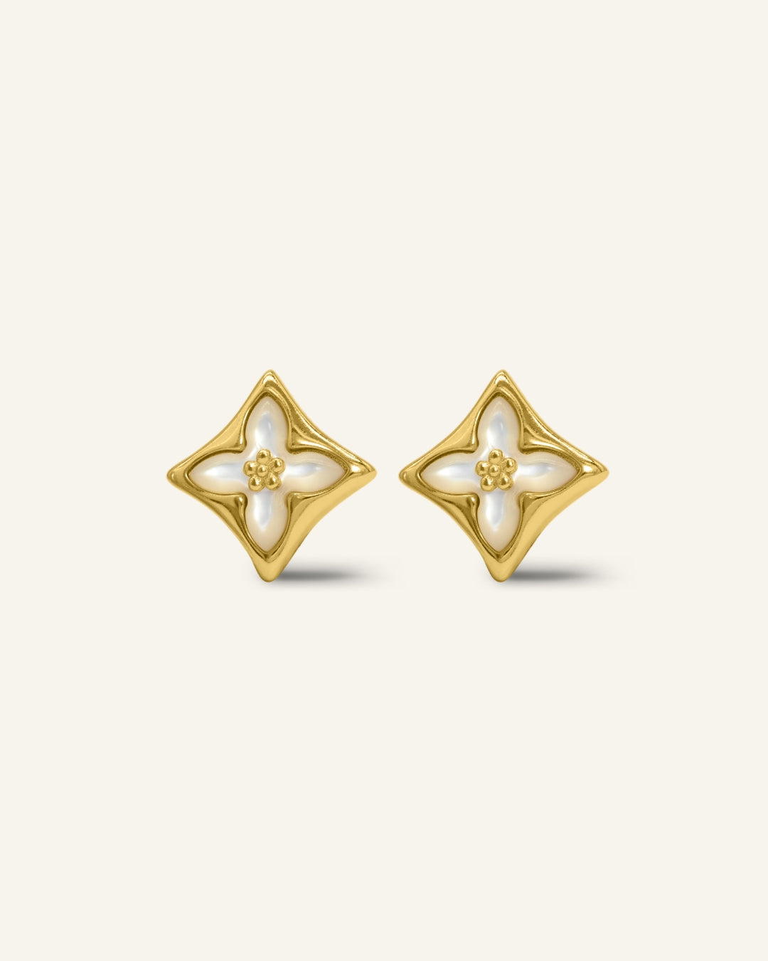 Luck meets bloom — Clover Monogram Ear Studs with a daisy twist in elegant white mother of pearl.