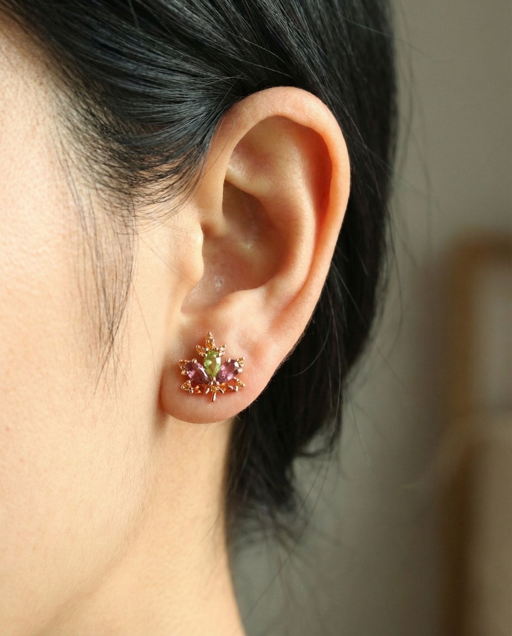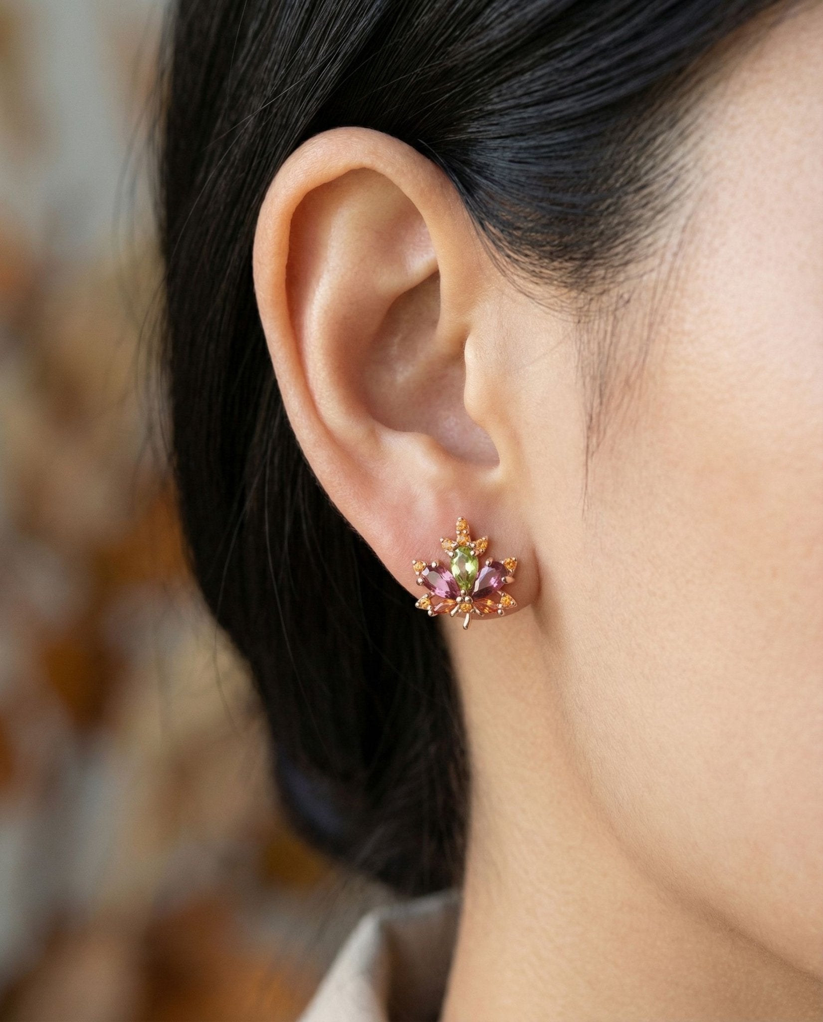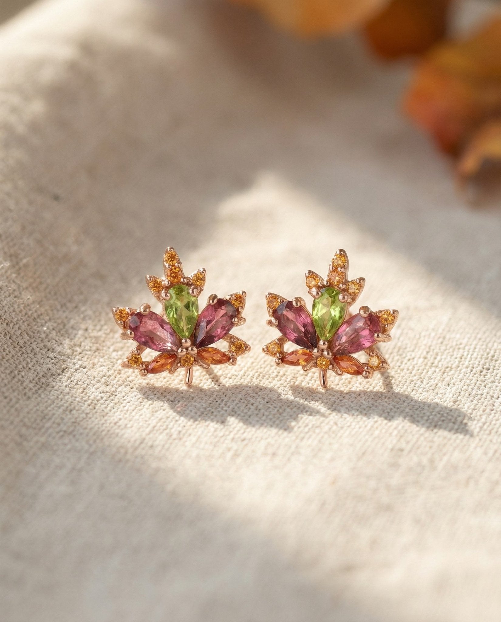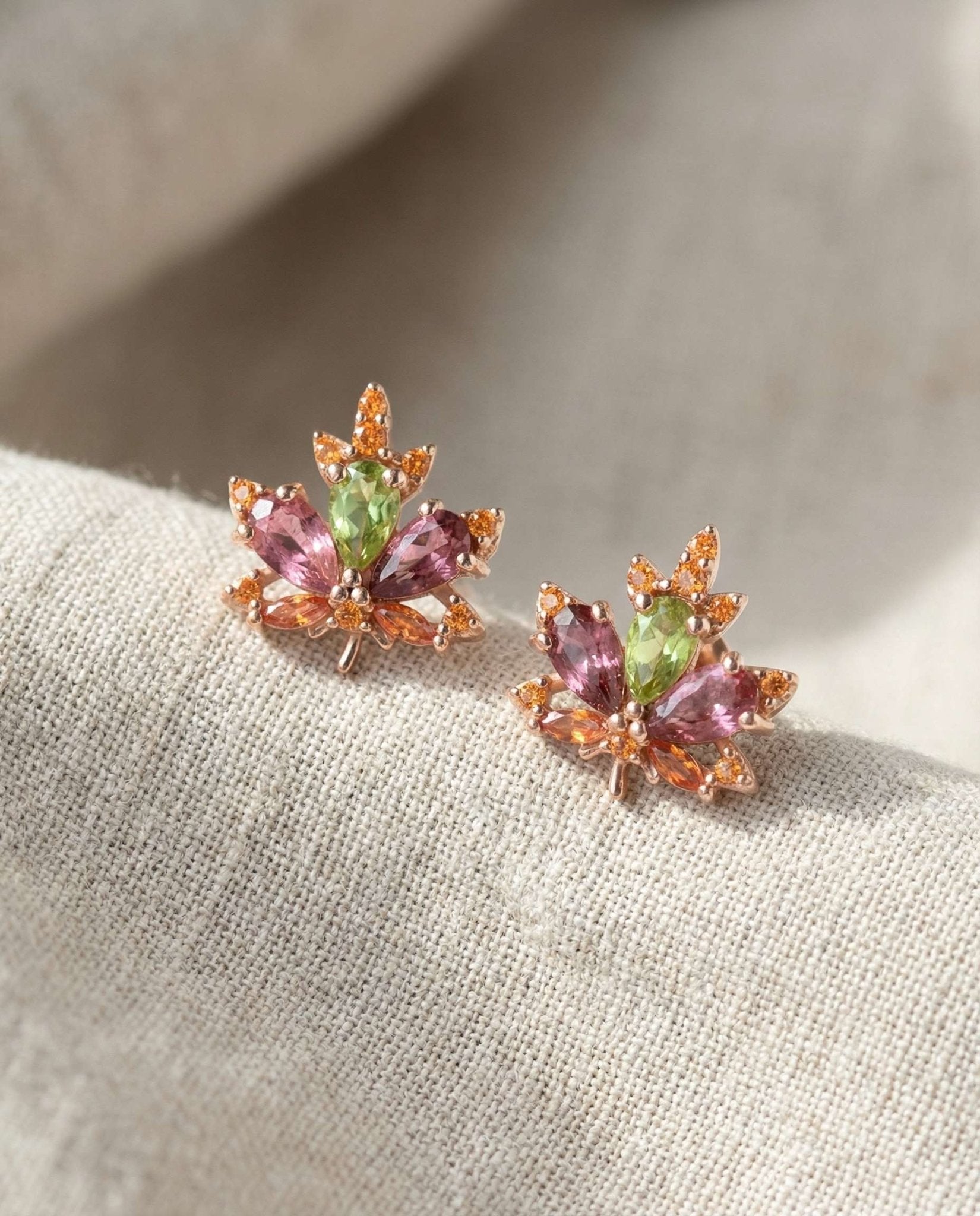 Meet the Maple Studs, tiny rose leaves kissed with pink tourmaline and peridot. Like autumn’s confetti and spring’s sparkle rolled into one, they’re little bursts of nature’s magic made to brighten your day.