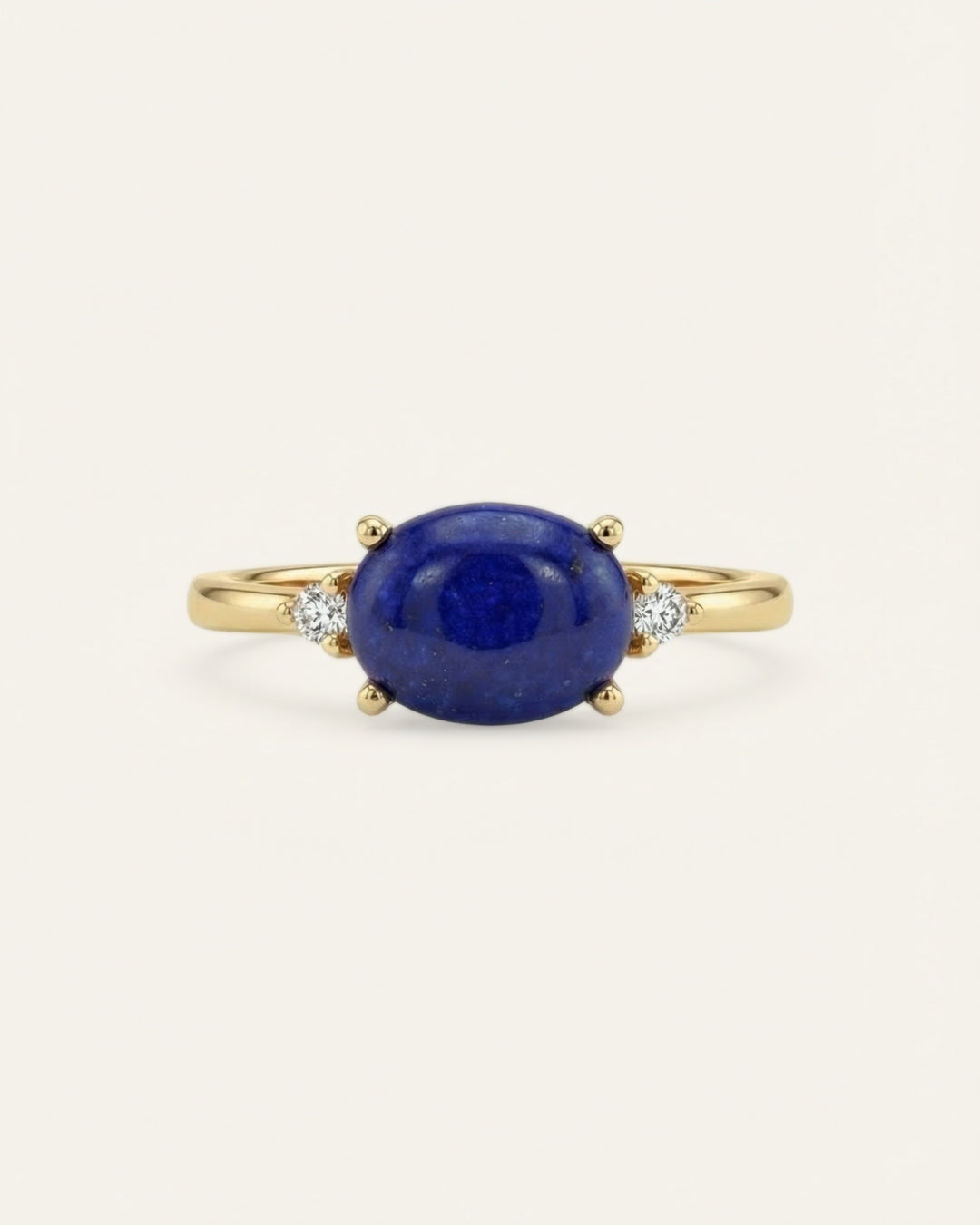 Deep blue, this Oval Lapis Lazuli Ring brings a rich, midnight tone to your everyday stack. The oval stone is set horizontally for a modern silhouette, classic gemstone, slightly unexpected setting.