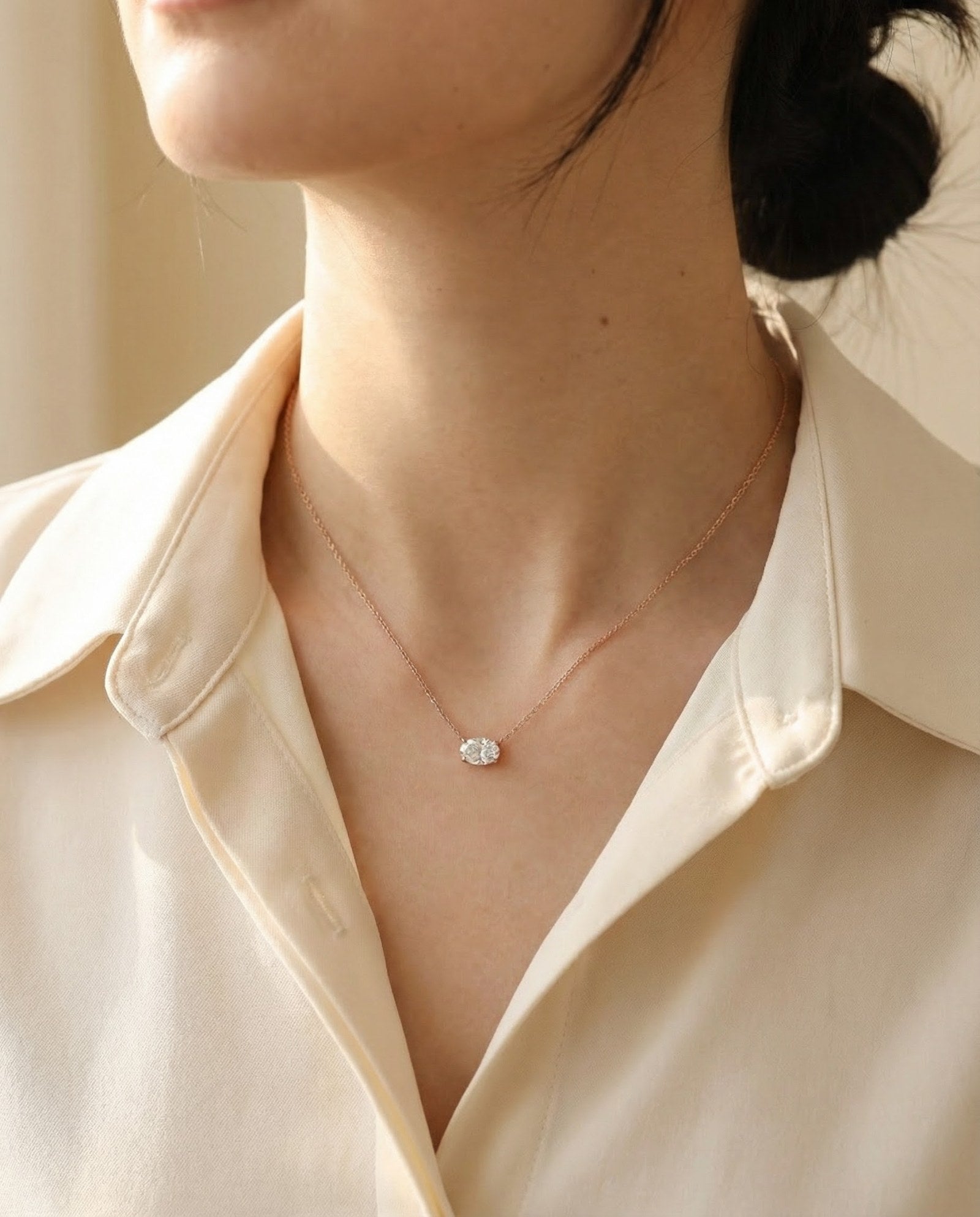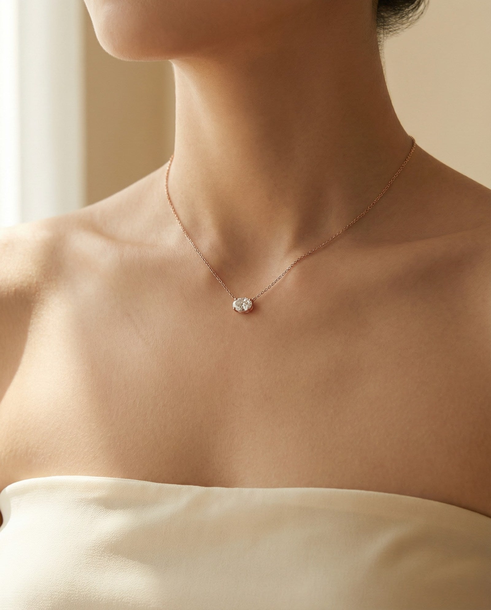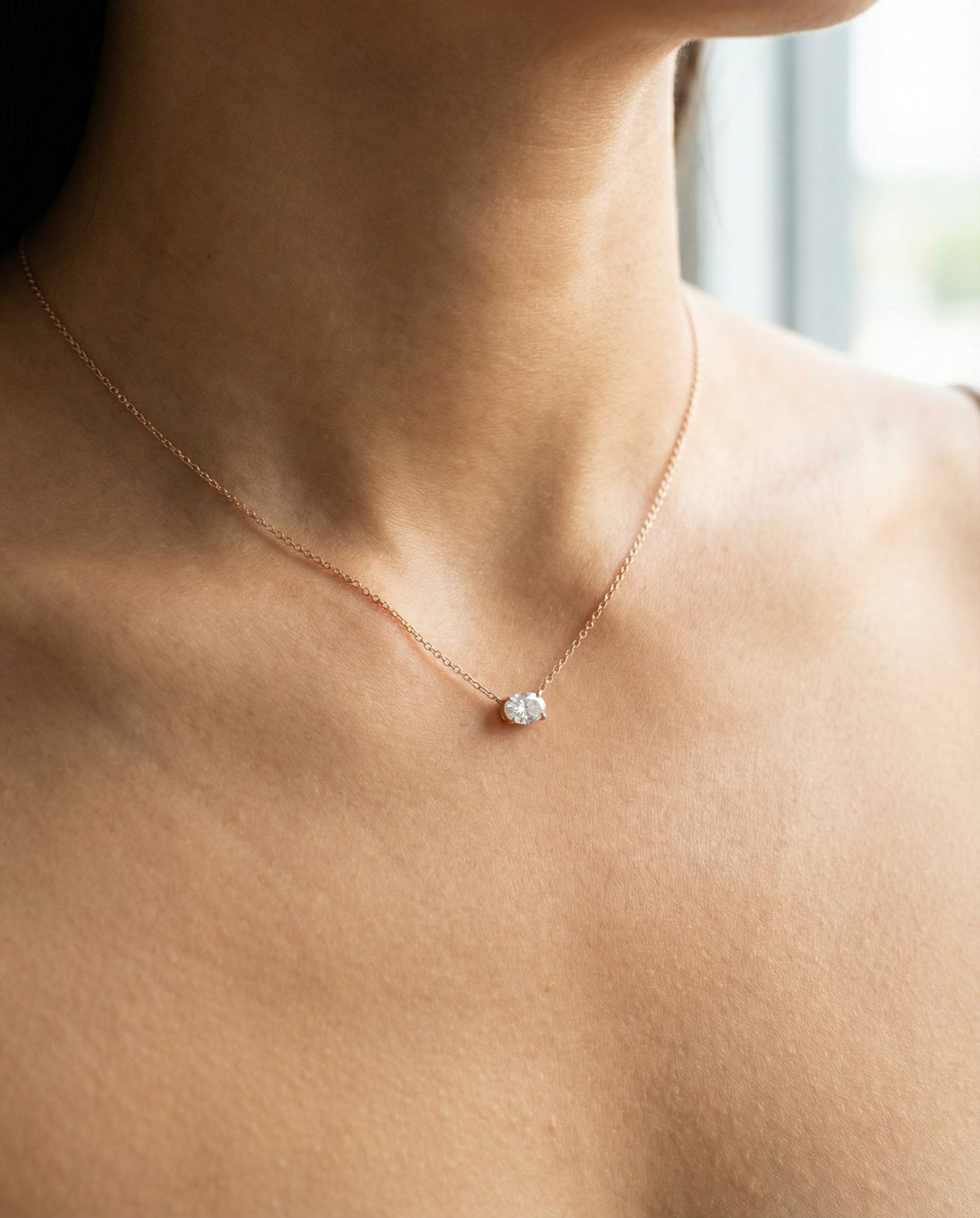 Set with a brilliant oval-cut moissanite, this necklace captures light from every angle with exceptional fire and clarity. The elongated silhouette feels soft yet refined - elegant without trying too hard.